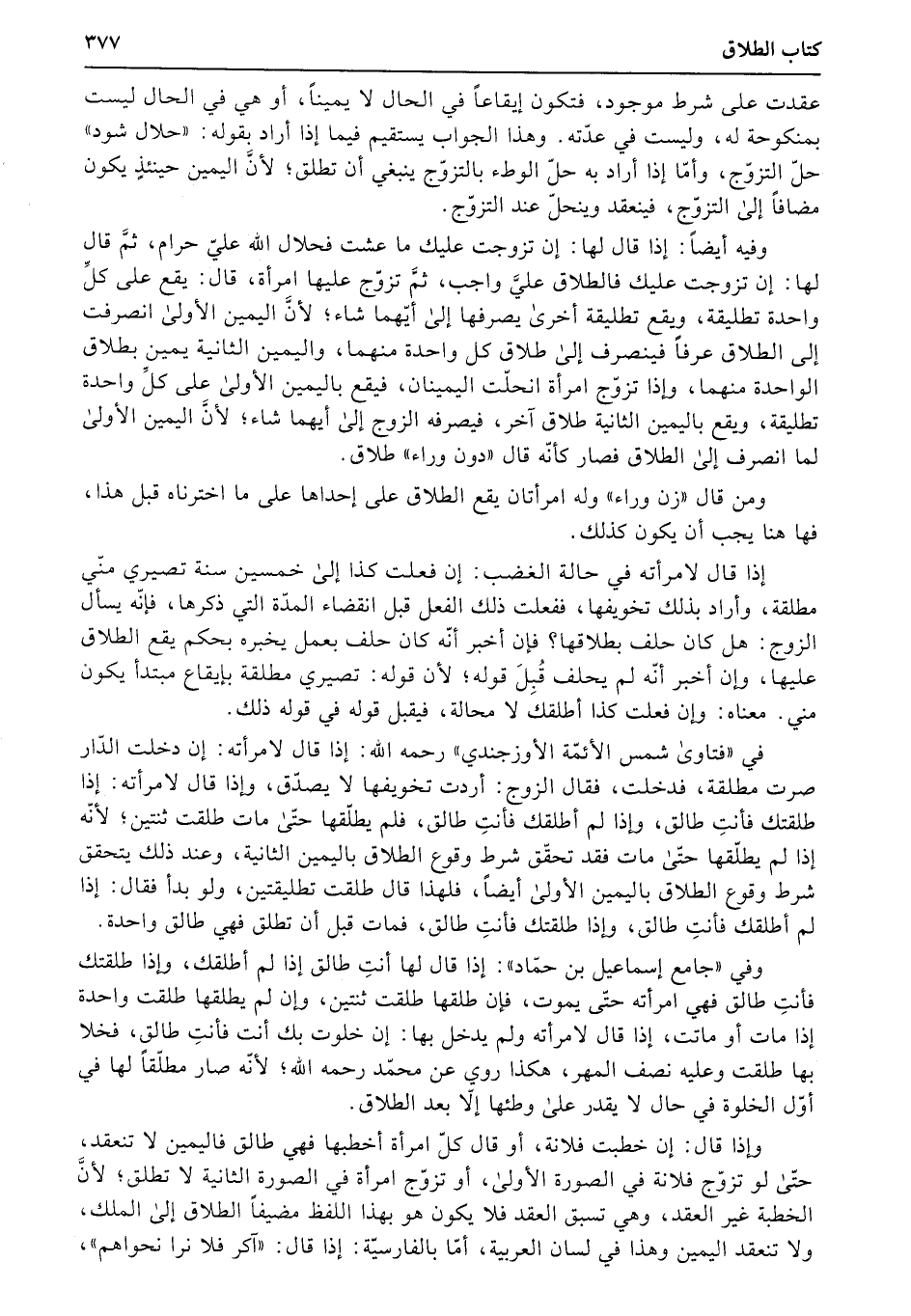 وفيه أيضاً: إذا قال لها: إن تزوجت عليك ما عشت فحلال الله عليّ حرام، ثمَّ قال لها: إن تزوجت عليك فالطلاق عليَّ واجب، ثمَّ تزوّج عليها امرأة، قال: يقع على كلِّ واحدة تطليقة، ويقع تطليقة أخرى يصرفها إلى أيّهما شاء؛ لأنَّ اليمين الأولى انصرفت إلى الطلاق عرفاً فينصرف إلى طلاق كل واحدة منهما، واليمين الثانية يمين بطلاق الواحدة منهما، وإذا تزوّج امرأة انحلّت اليمينان، فيقع باليمين الأولى على كلِّ واحدة تطليقة، ويقع باليمين الثانية طلاق آخر، فيصرفه الزوج إلى أيهما شاء؛ لأنَّ اليمين الأولى لما انصرف إلى الطلاق فصار كأنّه قال «دون وراء» طلاق.