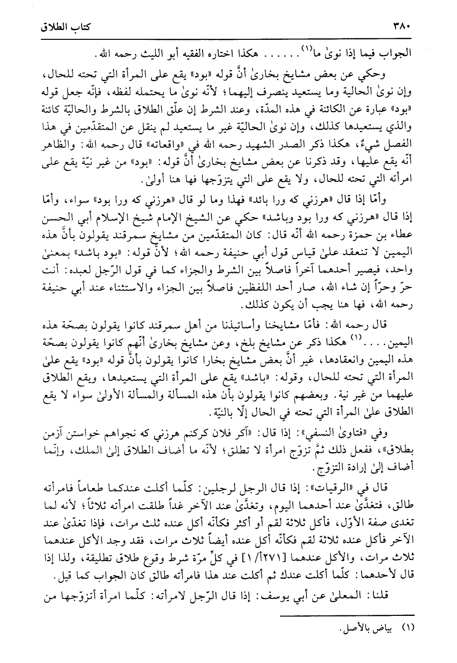 قال رحمه الله: فأمّا مشايخنا وأساتيذنا من أهل سمرقند كانوا يقولون بصحّة هذه اليمين...... هكذا ذكر عن مشايخ بلخ، وعن مشايخ بخارى أنّهم كانوا يقولون بصحّة هذه اليمين وانعقادها، غير أنَّ بعض مشايخ بخارا كانوا يقولون بأنَّ قوله «بود» يقع على المرأة التي تحته للحال، وقوله: «باشد» يقع على المرأة التي يستعيدها، ويقع الطلاق عليهما من غير نية.