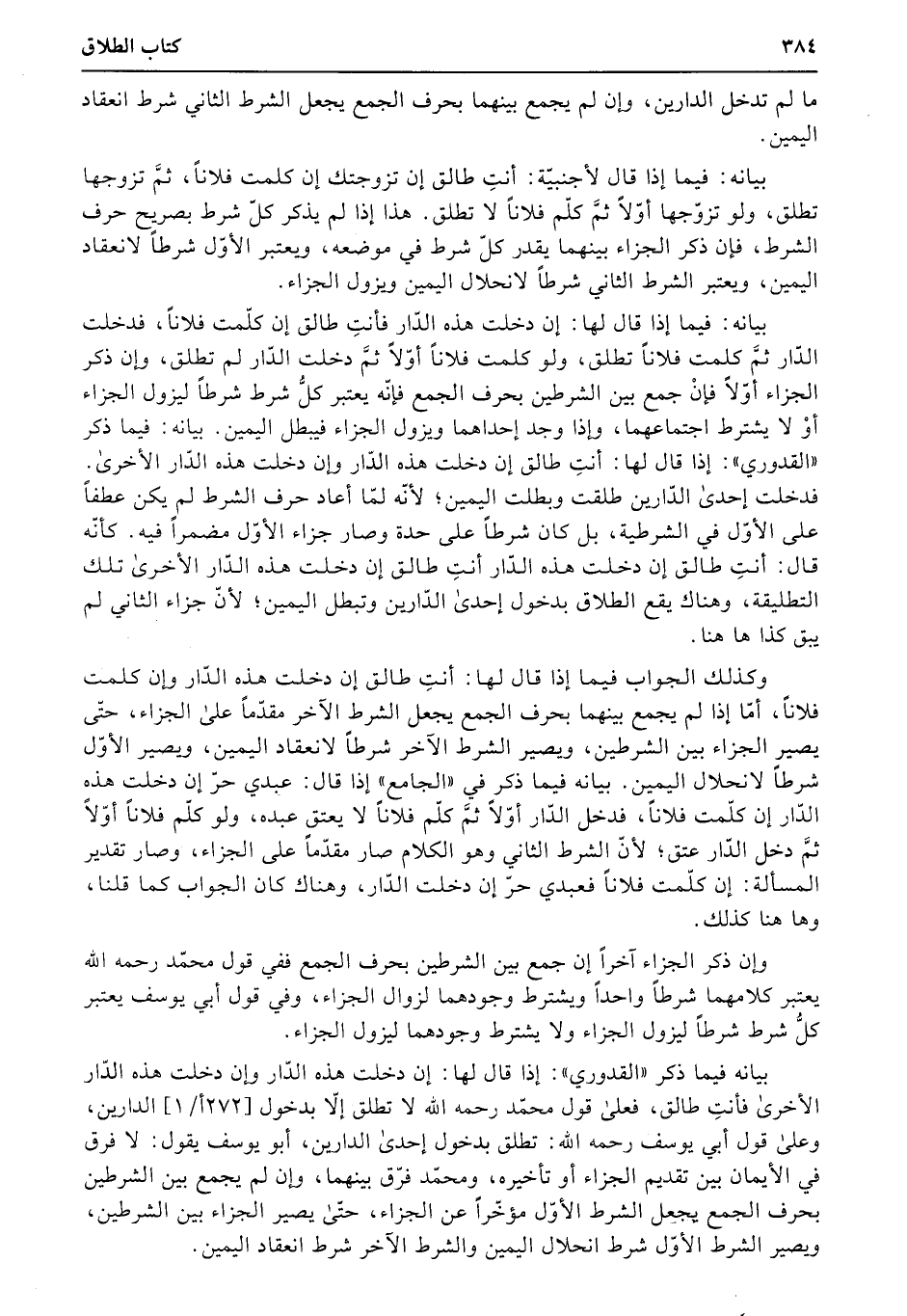 بيانه فيما ذكر «القدوري» : إذا قال لها: إن دخلت هذه الدّار وإن دخلت هذه الدّار الأخرى فأنتِ طالق، فعلى قول محمّد رحمه الله لا تطلق إلا بدخول (272أ1) الدارين، وعلى قول أبي يوسف رحمه الله: تطلق بدخول إحدى الدارين، أبو يوسف يقول: لا فرق في الأيمان بين تقديم الجزاء أو تأخيره، ومحمّد فرّق بينهما، وإن لم يجمع بين الشرطين بحرف الجمع يجعل الشرط الأوّل مؤخّراً عن الجزاء، حتّى يصير الجزاء بين الشرطين، ويصير الشرط الأوّل شرط انحلال اليمين والشرط الآخر شرط انعقاد اليمين.
