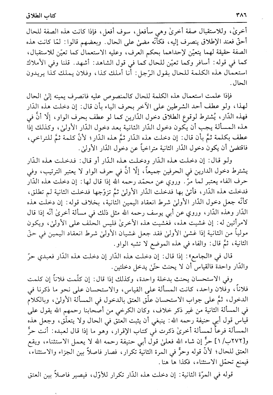 ولو قال: إن دخلت هذه الدّار ودخلت هذه الدّار أو قال: فدخلت هذه الدّار يشترط دخول الدارين في الحرفين جميعاً، إلا أنَّ في حرف الواو لا يعتبر الترتيب، وفي حرف الفاء يعتبر لما مرّ. وروي عن محمّد رحمه الله إذا قال لها: إن دخلت هذه الدّار فدخلت هذه الدّار، فأتى بها فدخلت الدّار الأولى ثمَّ تزوّجها فدخلت الثانية لم تطلق، كأنّه جعل دخول الدّار الأولى شرط انعقاد اليمين الثانية، بخلاف قوله: إن دخلت هذه الدّار وهذه الدّار، وروي عن أبي يوسف رحمه الله مثل ذلك في مسألة أخرى أنّه إذا قال لامرأتين له: إن غشيت هذه، فغشيت هذه الأخرى فليس الحلف على الأولى، ويكون مولياً من الثانية إذا غشى الأولى فقد جعل غشيان الأولى شرط انعقاد اليمين في حقّ الثانية، ثمَّ قال: والفاء في هذه الموضع لا تشبه الواو.