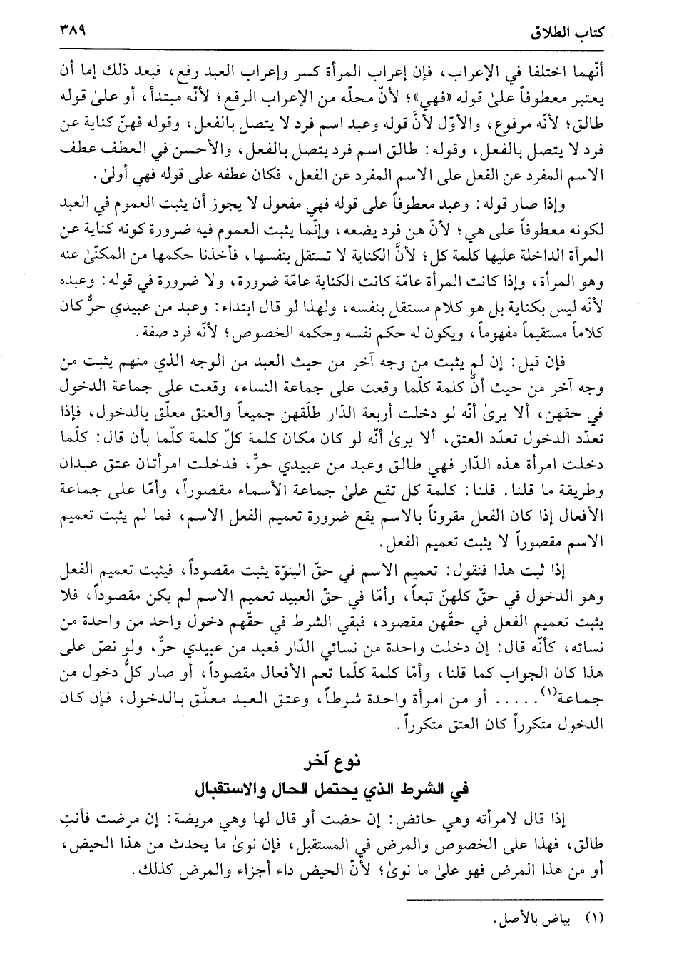 وإذا صار قوله: وعبد معطوفاً على قوله فهي مفعول لا يجوز أن يثبت العموم في العبد لكونه معطوفاً على هي؛ لأنّ هن فرد يضعه، وإنّما يثبت العموم فيه ضرورة كونه كناية عن المرأة الداخلة عليها كلمة كل؛ لأنَّ الكناية لا تستقل بنفسها، فأخذنا حكمها من المكنّى عنه وهو المرأة، وإذا كانت المرأة عامّة كانت الكناية عامّة ضرورة، ولا ضرورة في قوله: وعبده لأنّه ليس بكناية بل هو كلام مستقل بنفسه، ولهذا لو قال ابتداء: وعبد من عبيدي حرٌّ كان كلاماً مستقيماً مفهوماً، ويكون له حكم نفسه وحكمه الخصوص؛ لأنّه فرد صفة.