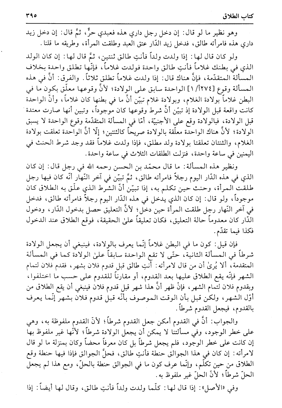والجواب: أنَّ في القدوم أمكن جعل القدوم شرطاً؛ لأنّ القدوم ملفوظة به، وهي على خطر الوجود، وفي مسألتنا لا يمكن أن يجعل الولادة شرطاً؛ لأنّها غير ملفوظ بها إن كانت على خطر الوجود، فلم يجعل شرطاً بل كان معرفاً محضاً وكان بمنزلة ما لو قال لامرأته: إن كان في هذا الجوالق حنطة فأنتِ طالق، فحلَّ الجوالق فإذا فيها حنطة وقع الطلاق من حين تكلّم، وإنّما عرف كون ما في الجوالق حنطة بالحلّ، ومع هذا لم يجعل الحلّ شرطاً؛ لأنّ الحلّ غير ملفوظ به.