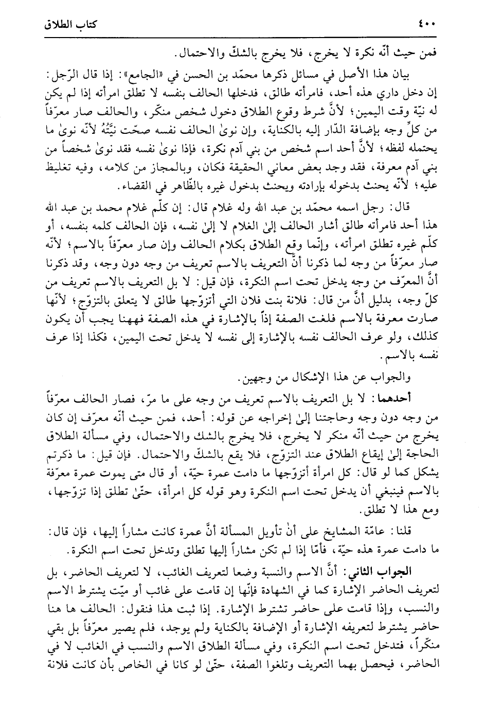 الجواب الثاني: أنَّ الاسم والنسبة وضعا لتعريف الغائب، لا لتعريف الحاضر، بل لتعريف الحاضر الإشارة كما في الشهادة فإنّها (إن) قامت على غائب أو ميّت يشترط الاسم والنسب، وإذا قامت على حاضر تشترط الإشارة. إذا ثبت هذا فنقول: الحالف ها هنا حاضر يشترط لتعريفه الإشارة أو الإضافة بالكناية ولم يوجد، فلم يصير معرّفاً بل بقي منكّراً، فتدخل تحت اسم النكرة، وفي مسألة الطلاق الاسم والنسب في الغائب لا في الحاضر، فيحصل بهما التعريف وتلغوا الصفة، حتّى لو كانا في الخاص بأن كانت فلانة