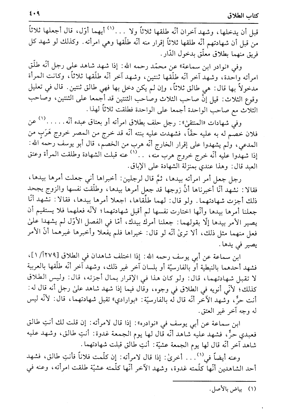 ابن سماعة عن أبي يوسف رحمه الله: إذا اختلف شاهدان في الطلاق (279أ1) ، فشهد أحدهما بالنبطية أو بالفارسيّة أو بلسان آخر غير ذلك، وشهد آخر أنّه طلّقها بالعربية لا تقبل شهادتهما، قال: ولو كان هذا في الإقرار بمال أجزته، قال: وليس الطلاق كذلك؛ لأنّي أنويه في الطلاق في وجوه، وقال فيما إذا شهد شاهد على رجل أنه قال له: أنت حرٌّ، وشهد الآخر أنّه قال له بالفارسيّة: «بوارادي» تقبل شهادتهما، قال: لأنّه ليس له وجه آخر غير العتق.