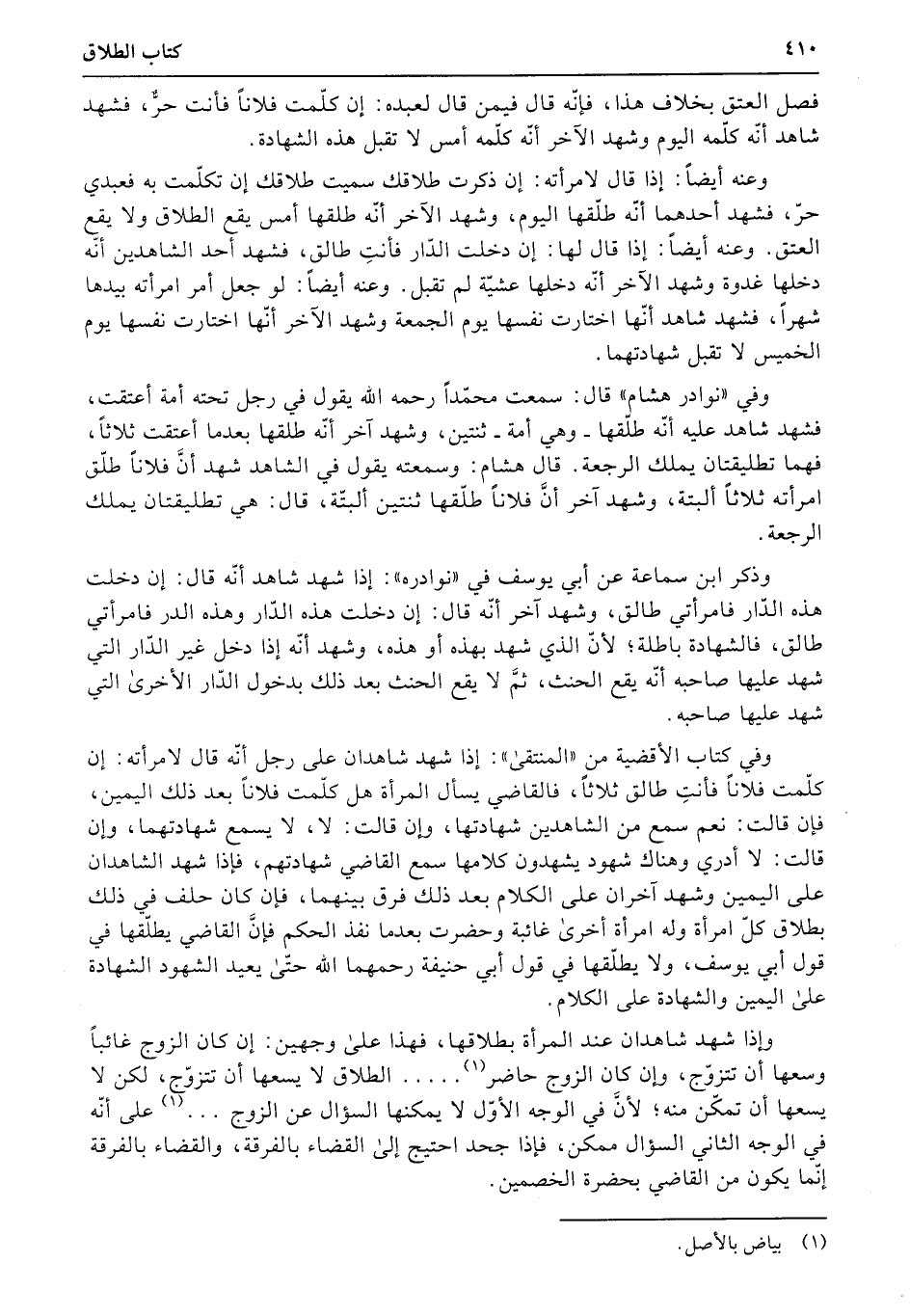 وإذا شهد شاهدان عند المرأة بطلاقها، فهذا على وجهين: إن كان الزوج غائباً وسعها أن تتزوّج، وإن كان الزوج حاضر....... الطلاق لا يسعها أن تتزوّج، لكن لا يسعها أن تمكّن منه؛ لأنَّ في الوجه الأوّل لا يمكنها السؤال عن الزوج ... على أنّه في الوجه الثاني السؤال ممكن، فإذا جحد احتيج إلى القضاء بالفرقة، والقضاء بالفرقة إنّما يكون من القاضي بحضرة الخصمين.