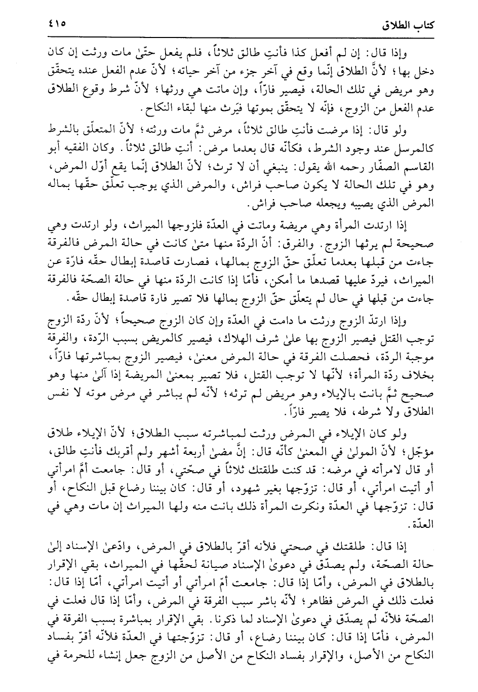 إذا ارتدت المرأة وهي مريضة وماتت في العدّة فلزوجها الميراث، ولو ارتدت وهي صحيحة لم يرثها الزوج. والفرق: أنّ الردّة منها متى كانت في حالة المرض فالفرقة جاءت من قبلها بعدما تعلّق حقّ الزوج بمالها، فصارت قاصدة إبطال حقّه فارّة عن الميراث، فيردّ عليها قصدها ما أمكن، فأمّا إذا كانت الردّة منها في حالة الصحّة فالفرقة جاءت من قبلها في حال لم يتعلّق حقّ الزوج بمالها فلا تصير فارة قاصدة إبطال حقّه.
