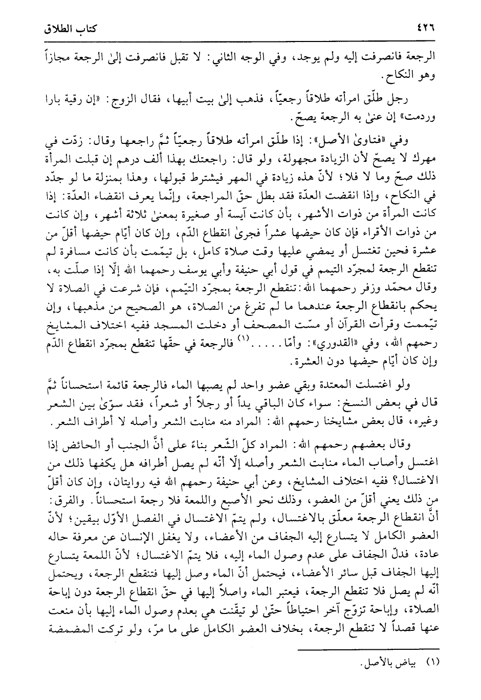 ولو اغتسلت المعتدة وبقي عضو واحد لم يصبها الماء فالرجعة قائمة استحساناً ثمَّ قال في بعض النسخ: سواء كان الباقي يداً أو رجلاً أو شعراً، فقد سوّى بين الشعر وغيره، قال بعض مشايخنا رحمهم الله: المراد منه منابت الشعر وأصله لا أطراف الشعر.