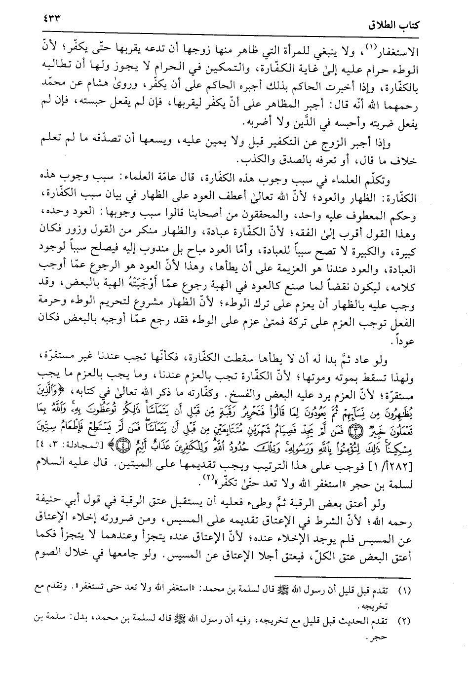 ولو عاد ثمَّ بدا له أن لا يطأها سقطت الكفّارة، فكأنّها تجب عندنا غير مستقرّة، ولهذا تسقط بموته وموتها؛ لأنّ الكفّارة تجب بالعزم عندنا، وما يجب بالعزم ما يجب مستقرّة؛ لأنّ العزم يرد عليه البعض والفسخ. وكفّارته ما ذكر الله تعالى في كتابه، {وَالَّذِينَ يُظَهِرُونَ مِن نّسَآئِهِمْ ثُمَّ يَعُودُونَ لِمَا قَالُواْ فَتَحْرِيرُ رَقَبَةٍ مّن قَبْلِ أَن يَتَمَآسَّا ذَلِكُمْ تُوعَظُونَ بِهِ وَاللَّهُ بِمَا تَعْمَلُونَ خَبِيرٌ فَمَن لَّمْ يَجِدْ فَصِيَامُ شَهْرَيْنِ مُتَتَابِعَيْنِ مِن قَبْلِ أَن يَتَمَآسَّا فَمَن لَّمْ يَسْتَطِعْ فَإِطْعَامُ سِتّينَ مِسْكِيناً ذَلِكَ لِتُؤْمِنُواْ بِاللَّهِ وَرَسُولِهِ وَتِلْكَ حُدُودُ اللَّهِ وَلِلْكَفِرِينَ عَذَابٌ أَلِيمٌ} (المجادلة: 3، 4) (282أ1) فوجب على هذا الترتيب ويجب تقديمها على الميتين. قال عليه السلام لسلمة بن حجر «استغفر الله ولا تعد حتّى تكفّر» .