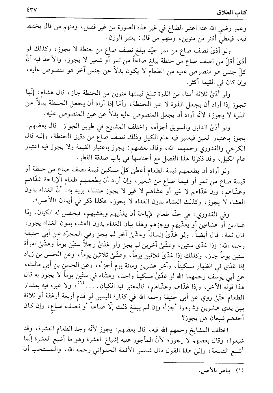 وفي القدوري: في حقّه طعام الإباحة أن يغدّيهم ويغشّيهم، فيحصل له الكيان، إمّا غداءين أو عشاءين أو يعشّيهم ويجزهم وهذا بيان الغداء بدون العشاء بدون الغداء يجوز، قال ثمة: قال أيضاً: ولو غدّى إنساناً وعشّى آخر لم يجز وفي المجرّد عن أبي حنيفة رحمه الله: إذا غدّى ستين، وعشّى آخرين لم يجز ولو غدّى رجلاً ستيّن يوماً وعشّى امرأة ستين يوماً جاز، وكذلك إذا غدّى ثلاثين يوماً، وعشّى ثلاثين يوماً، وعن الحسن بن زياد إذا غدّى في الظهار مسكيناً، وآخر عشرين ومائة يوم أجزأه، وعن الحسن بن أبي مالك، عن أبي يوسف رحمهما الله لو غدّى مسكيناً واحد، وعشّاه في ستّين يوماً لا يجوز به قال هذا قوله الآخر، وإذا غدّاهم وعشّاهم، فالمعتبر فيه الكيان......، ولا غيره فيه بمقدار الطعام حتّى روي عن أبي حنيفة رحمه الله في كفارة اليمين لو قدم أربعة أرغفة أو ثلاثة بين يدي عشرين وشبعوا أجزأه وإن لم يبلغ ذلك إلا صاعاً أو نصف صاعٍ، وإن كان أحدهم شبعان هل يجوز؟