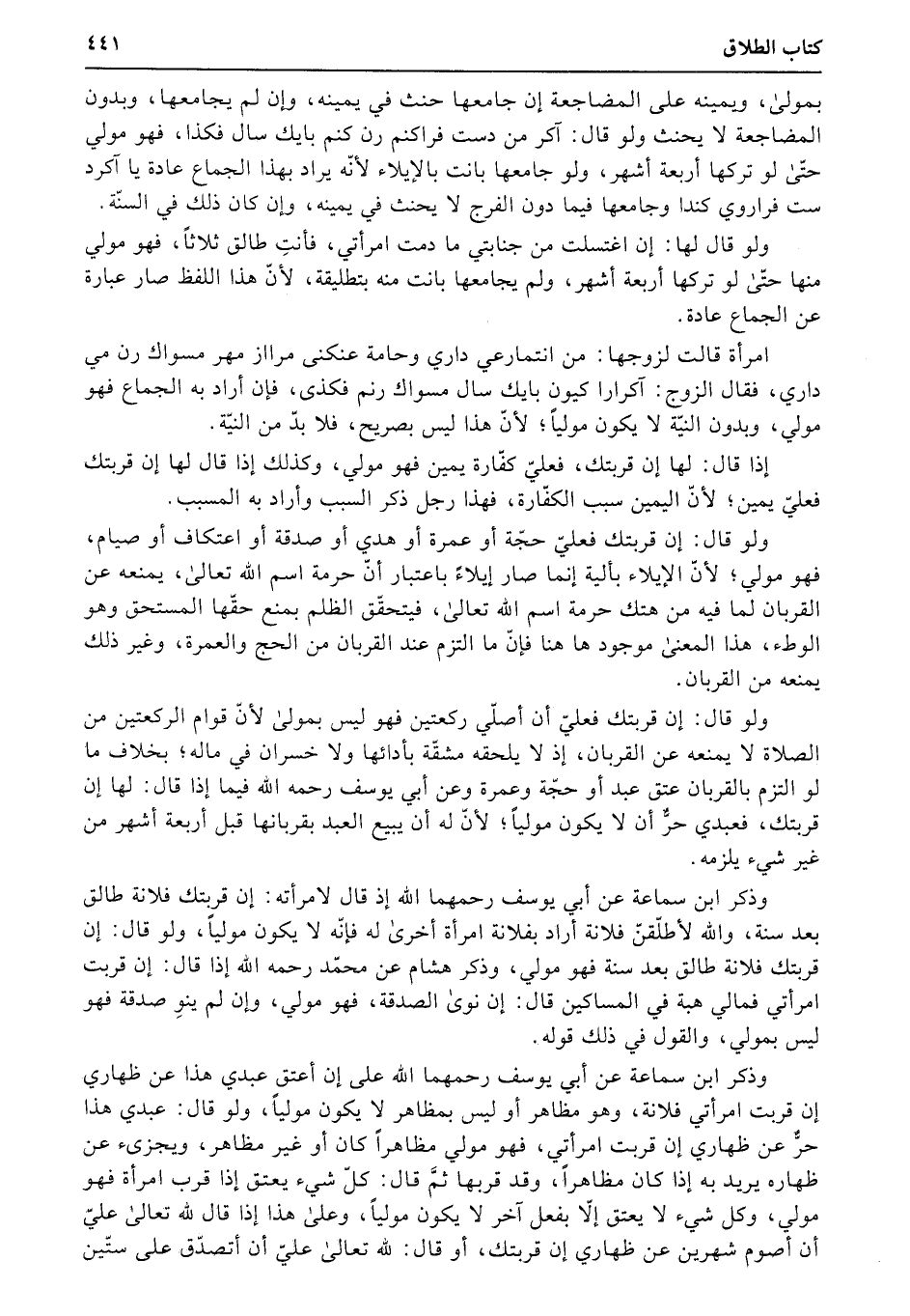ولو قال: إن قربتك فعليّ أن أصلّي ركعتين فهو ليس بمولى لأنّ قوام الركعتين من الصلاة لا يمنعه عن القربان، إذ لا يلحقه مشقّة بأدائها ولا خسران في ماله؛ بخلاف ما لو التزم بالقربان عتق عبد أو حجّة وعمرة وعن أبي يوسف رحمه الله فيما إذا قال: لها إن قربتك، فعبدي حرٌّ أن لا يكون مولياً؛ لأنّ له أن يبيع العبد بقربانها قبل أربعة أشهر من غير شيء يلزمه.