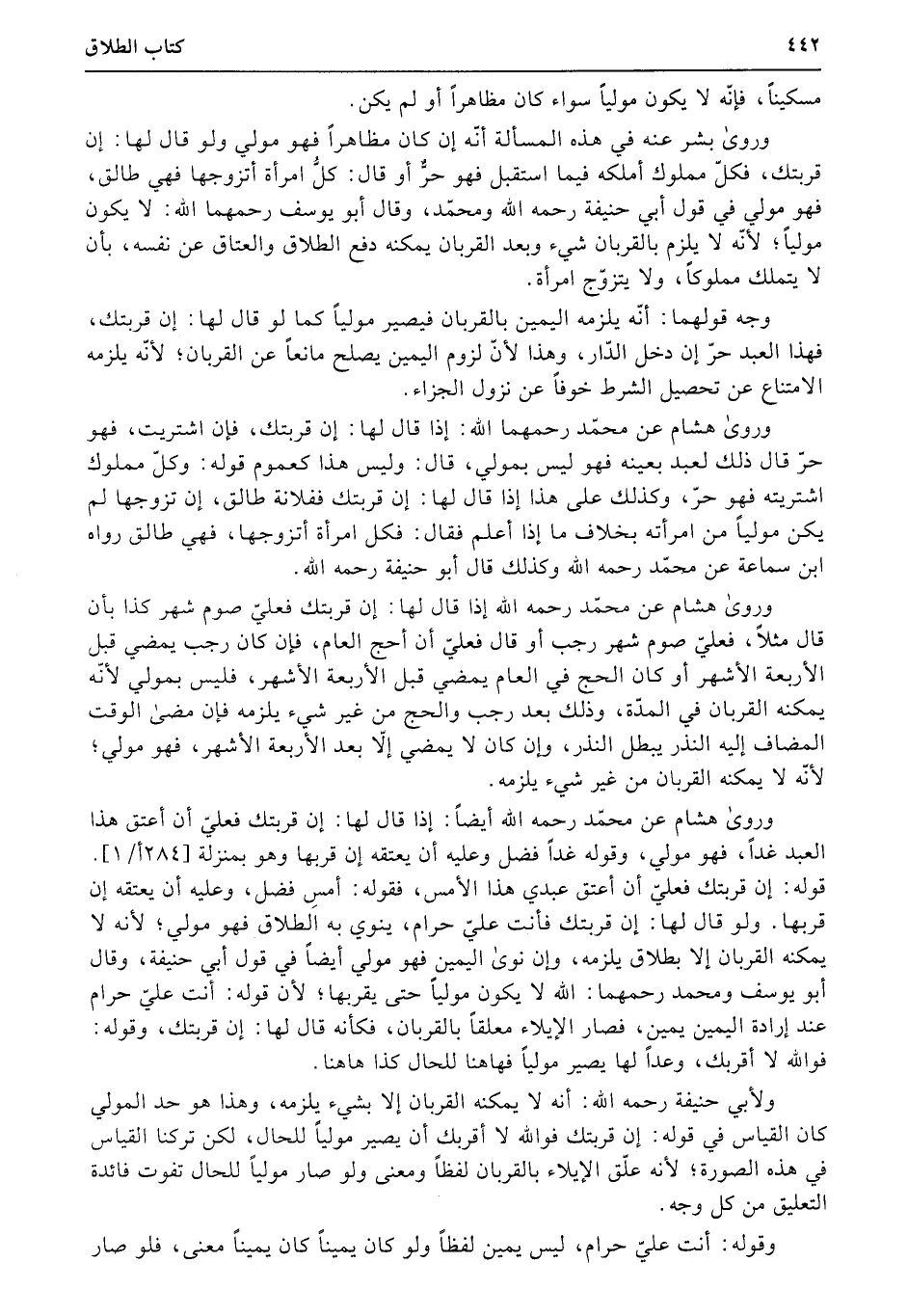 وروى هشام عن محمّد رحمهما الله: إذا قال لها: إن قربتك، فإن اشتريت، فهو حرّ قال ذلك لعبد بعينه فهو ليس بمولى، قال: وليس هذا كعموم قوله: وكلّ مملوك اشتريته فهو حرّ، وكذلك على هذا إذا قال لها: إن قربتك ففلانة طالق، إن تزوجها لم يكن مولياً من امرأته بخلاف ما إذا أعلم فقال: فكل امرأة أتزوجها، فهي طالق رواه ابن سماعة عن محمّد رحمه الله وكذلك قال أبو حنيفة رحمه الله.