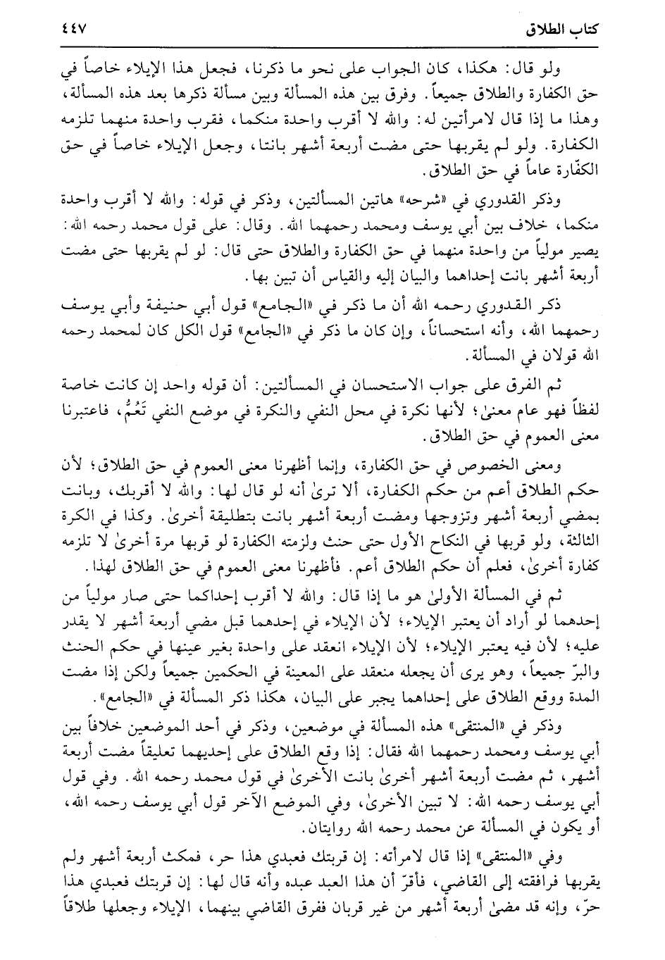 ومعنى الخصوص في حق الكفارة، وإنما أظهرنا معنى العموم في حق الطلاق؛ لأن حكم الطلاق أعم من حكم الكفارة، ألا ترى أنه لو قال لها: والله لا أقربك، وبانت بمضي أربعة أشهر وتزوجها ومضت أربعة أشهر بانت بتطليقة أخرى. وكذا في الكرة الثالثة، ولو قربها في النكاح الأول حتى حنث ولزمته الكفارة لو قربها مرة أخرى لا تلزمه كفارة أخرى، فعلم أن حكم الطلاق أعم. فأظهرنا معنى العموم في حق الطلاق لهذا.