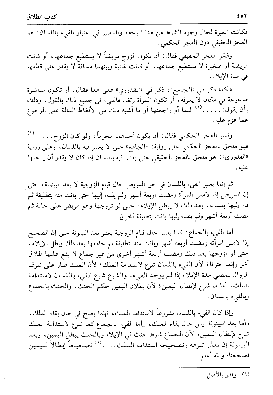 وإذا كان الفيء باللسان مشروعاً لاستدامة الملك، فإنما يصح في حال بقاء الملك، وأما بعد البينونة ليس حال بقاء الملك، وأما الفيء بالجماع كما شرع لاستدامة الملك شرع لإبطال اليمين؛ لأن الجماع شرط حنث في الإيلاء وبالحنث يبطل اليمين، وبعد البينونة إن تعذر شرعه وتصحيحه استدامة الملك.... تصحيحاً إبطالاً لليمين فصححناه والله أعلم.