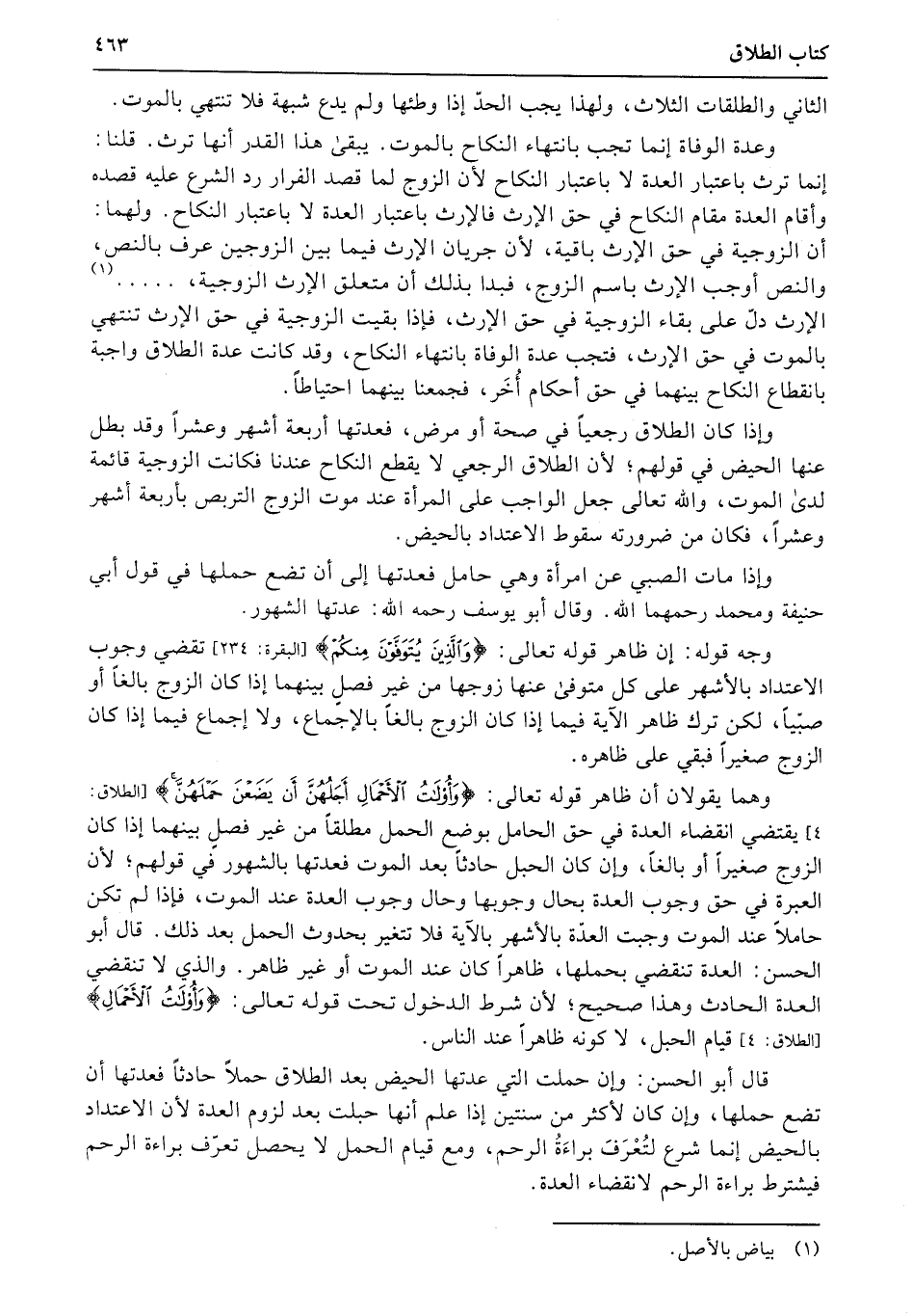 وعدة الوفاة إنما تجب بانتهاء النكاح بالموت. يبقى هذا القدر أنها ترث. قلنا: إنما ترث باعتبار العدة لا باعتبار النكاح لأن الزوج لما قصد الفرار رد الشرع عليه قصده وأقام العدة مقام النكاح في حق الإرث فالإرث باعتبار العدة لا باعتبار النكاح. ولهما: أن الزوجية في حق الإرث باقية، لأن جريان الإرث فيما بين الزوجين عرف بالنص، والنص أوجب الإرث باسم الزوج، فبدا بذلك أن متعلق الإرث الزوجية،..... الإرث دلّ على بقاء الزوجية في حق الإرث، فإذا بقيت الزوجية في حق الإرث تنتهي بالموت في حق الإرث، فتجب عدة الوفاة بانتهاء النكاح، وقد كانت عدة الطلاق واجبة بانقطاع النكاح بينهما في حق أحكام أُخَر، فجمعنا بينهما احتياطاً.