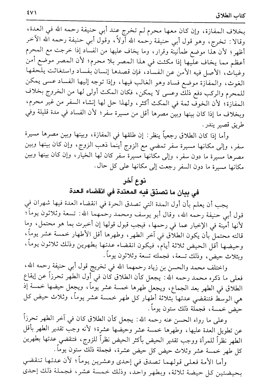 بخلاف المفازة، وإن كان معها محرم لم تخرج عند أبي حنيفة رحمه الله في العدة، وقالا: تخرج، وهو قول أبي حنيفة رحمه الله أولاً، وقول أبي حنيفة رحمه الله الآخر أظهر؛ لأن هذا موضع طمأنينة وقرار، وما يخاف عليها من الفساد إذا خرجت مع المحرم أعظم مما يخاف عليها إذا مكثت في هذا المصر بلا محرم؛ لأن المصر موضع أمن وغياث، الأصل فيه الأمن عن الفساد، فإن قصدها إنسان بفساد واستغاثت يلحقها الغوث، والمفازة موضع فساد وهو الغالب فيها، وإذا توجه إليها الفساد عسى يمكن للمحرم والركب دفع ذلك وعسى لا يمكن، فكان المكث أولى لها من الخروج بخلاف المفازة؛ لأن الخوف ثمة في المكث أكثر، ولهذا حل لها إنشاء السفر من غير محرم، وبخلاف ما إذا كان بينها وبين مصرها أقل من مسيرة سفر؛ لأن الفساد في مدة قليلة وفي طريق قصير يندر.