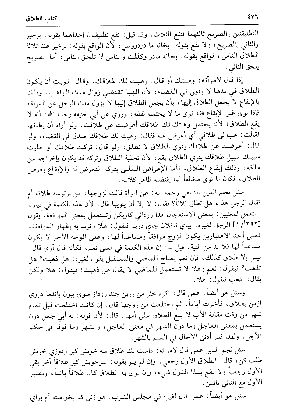 سئل نجم الدين عمن قال لامرأته: داست يك طلاق سه خويش كير ودوزي خويش طلب كن، قال: الطلاق الأول رجعي، وإن لم ينو بقوله: سرخويش كير طلاقاً آخر بقي الأول رجعياً ولا يقع بهذا القول شيء، وإن نوى به الطلاق كان طلاقاً بائناً، ويصير الأول مع الثاني بائنين.