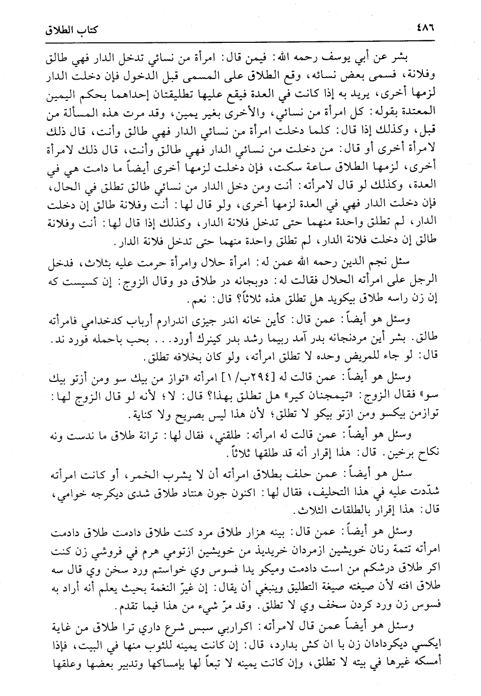 وسئل هو أيضاً: عمن قال: بينه هزار طلاق مرد كنت طلاق دادمت طلاق دادمت امرأته تتمة رنان خويشين ازمردان خريديذ من خويشين ازتومي هرم في فروشي زن كنت اكر طلاق درشكم من است دادمت وميكو يدا فسوس وي خواستم ورد سخن وي قال سه طلاق افته لأن صيغته صيغة التطليق وينبغي أن يقال: إن غيرّ النغمة بحيث يعلم أنه أراد به فسوس زن ورد كردن سخف وي لا تطلق. وقد مرّ شيء من هذا فيما تقدم.
