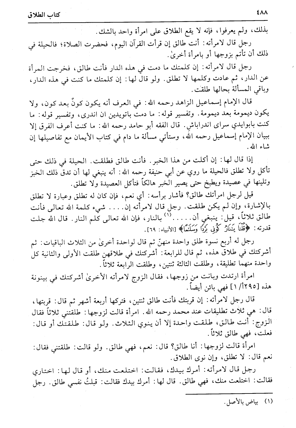 قيل لرجل امرأتك طالق؟ فأشار برأسه: أي نعم، فإن كان له تطلق وعبارة لا تطلق بالإشارة، وإن لم يكن طلقت. رجل قال لامرأته إن.... شيء كلمة الله تعالى فأنت طالق ثلاثاً، قيل: ينبغي أن..... بالنار، فإن الله تعالى كلم النار. قال الله جلت قدرته: {قلنا يا نار كوني برداً وسلاماً} (الأنبياء: 69) .