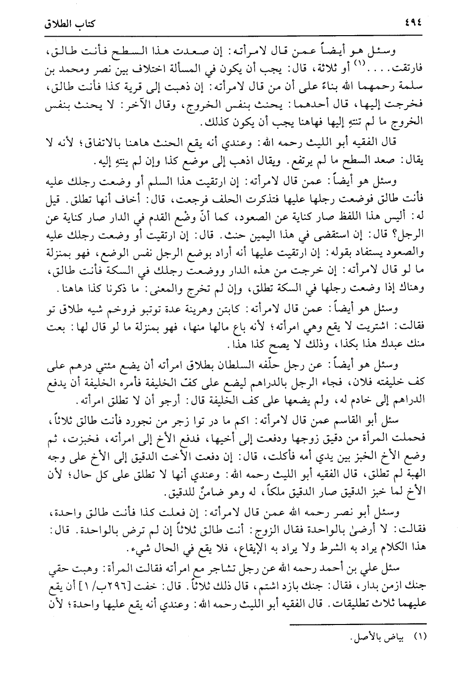 وسئل هو أيضاً عمن قال لامرأته: إن صعدت هذا السطح فأنت طالق، فارتقت.... أو ثلاثة، قال: يجب أن يكون في المسألة اختلاف بين نصر ومحمد بن سلمة رحمهما الله بناءً على أن من قال لامرأته: إن ذهبت إلى قرية كذا فأنت طالق، فخرجت إليها، قال أحدهما: يحنث بنفس الخروج، وقال الآخر: لا يحنث بنفس الخروج ما لم تنتهِ إليها فهاهنا يجب أن يكون كذلك.