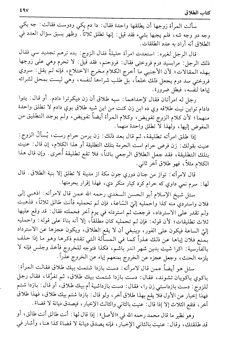 إذا طلق امرأته تطليقة، ثم قال بعد ذلك: زن برمن حرام رست، يُسألُ الزوج: عنيت بقولك: زن فرض حرام است الحرمة بتلك التطليقة أو هذا الكلام، إن قال: عنيت بتلك التطليقة، فقد جعل الطلاق الرجعي بائناً، فلا تقع تطليقة أُخرى. وإن قال هذا الكلام مثلاً، فهو طلاق آخر ثاني.