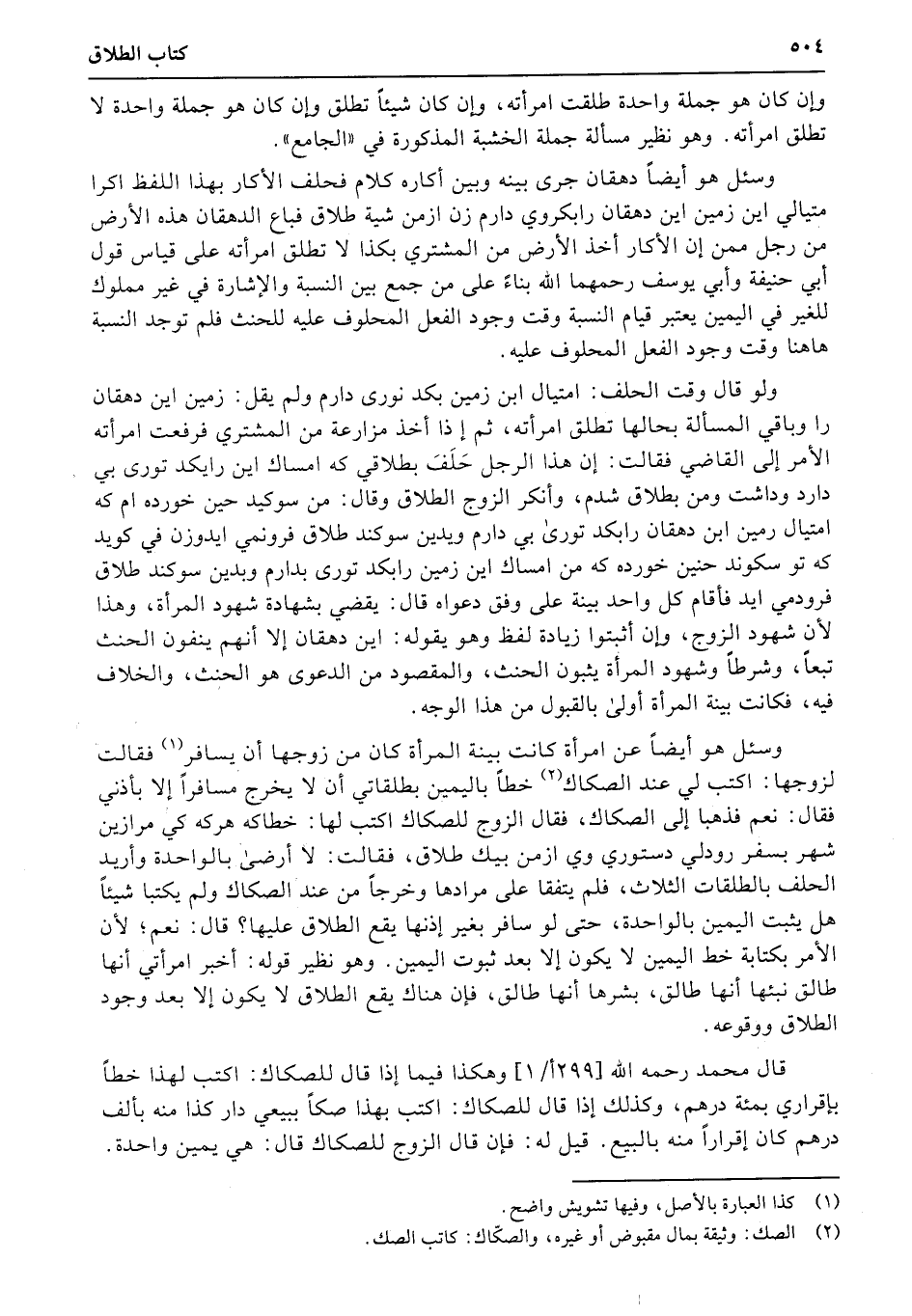 وسئل هو أيضاً عن امرأة كانت بينة المرأة كان من زوجها أن يسافر فقالت لزوجها: ايدل لي عند الصكاك خطاً باليمين بطلقاتي أن لا يخرج مسافراً إلا بأذني فقال: نعم فذهبا إلى الصكاك، فقال الزوج للصكاك اكتب لها: خطاكه هركه كي مرازين شهر بسفر رودلي دستوري وي ازمن بيك طلاق، فقالت: لا أرضى بالواحدة وأريد الحلف بالطلقات الثلاث، فلم يتفقا على مرادها وخرجاً من عند الصكاك (ولم يكتبا) شيئاً هل يثبت اليمين بالواحدة، حتى لو سافر بغير إذنها يقع الطلاق عليها؟ قال: نعم؛ لأن الأمر بكتابة خط اليمين لا يكون إلا بعد ثبوت اليمين. وهو نظير قوله: أخبر امرأتي أنها طالق نبئها أنها طالق، بشرها أنها طالق، فإن هناك يقع الطلاق لا يكون إلا بعد وجود الطلاق ووقوعه.