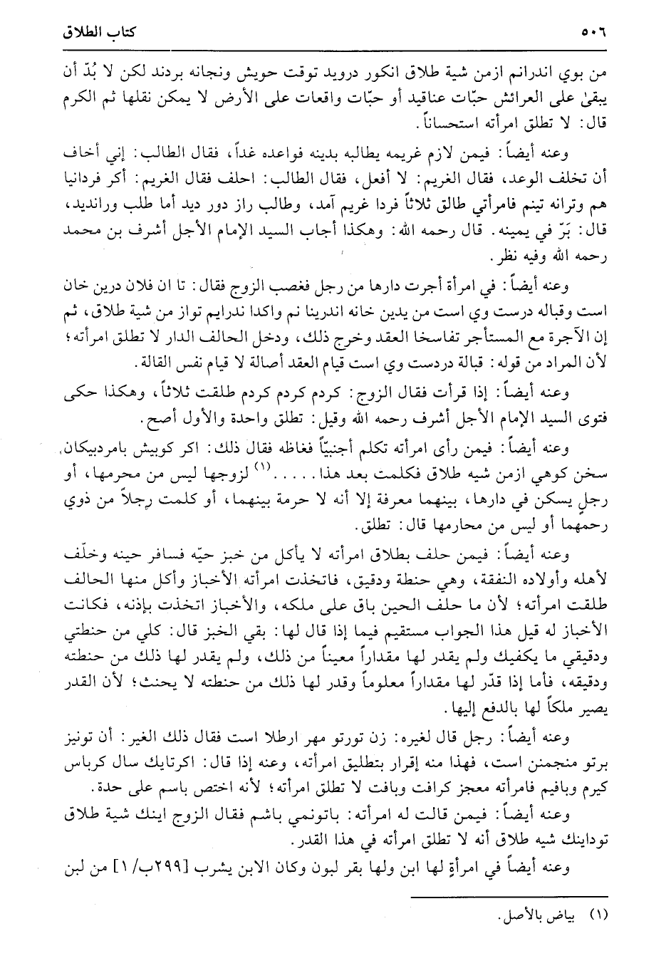 وعنه أيضاً: فيمن رأى امرأته تكلم أجنبيّاً فغاظه فقال ذلك: اكر كوبيش بامردبيكان سخن كوهي ازمن شيه طلاق فكلمت بعد هذا..... لزوجها ليس من محرمها، أو رجلٍ يسكن في دارها، بينهما معرفة إلا أنه لا حرمة بينهما، أو كلمت رجلاً من ذوي رحمهما أو ليس من محارمها قال: تطلق.