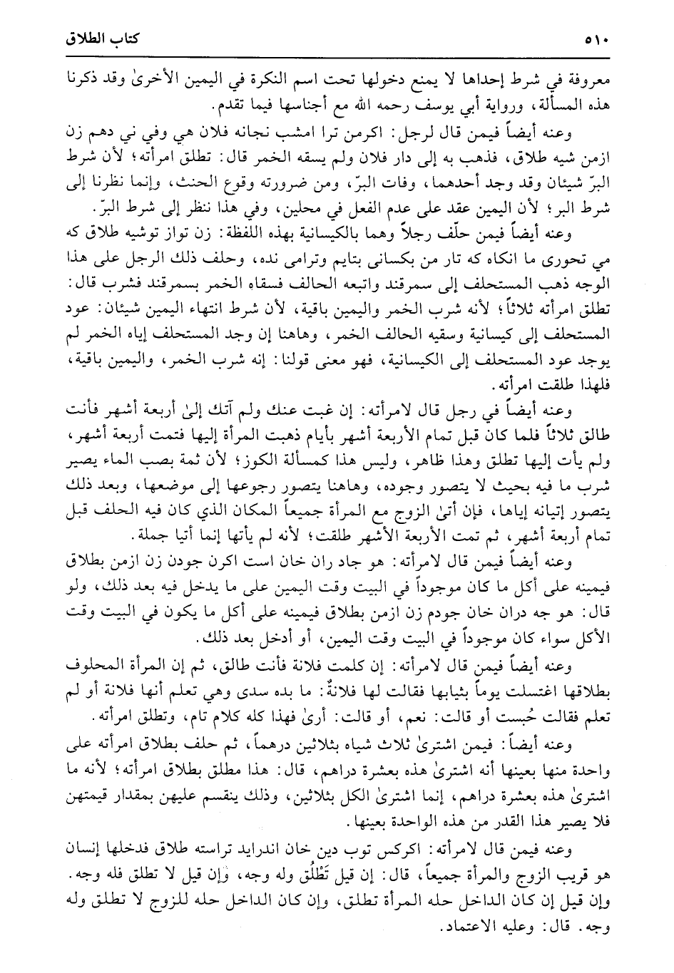 وعنه أيضاً فيمن حلّف رجلاً وهما بالكيسانية بهذه اللفظة: زن تواز توشيه طلاق كه مي تحورى ما انكاه كه تار من بكسانى بتايم وترامى نده، وحلف ذلك الرجل على هذا الوجه ذهب المستحلف إلى سمرقند واتبعه الحالف فسقاه الخمر بسمرقند فشرب قال: تطلق امرأته ثلاثاً؛ لأنه شرب الخمر واليمين باقية، لأن شرط انتهاء اليمين شيئان: عود المستحلف إلى كيسانية وسقيه الحالف الخمر، وهاهنا إن وجد المستحلف إياه الخمر لم يوجد عود المستحلف إلى الكيسانية، فهو معنى قولنا: إنه شرب الخمر، واليمين باقية، فلهذا طلقت امرأته.