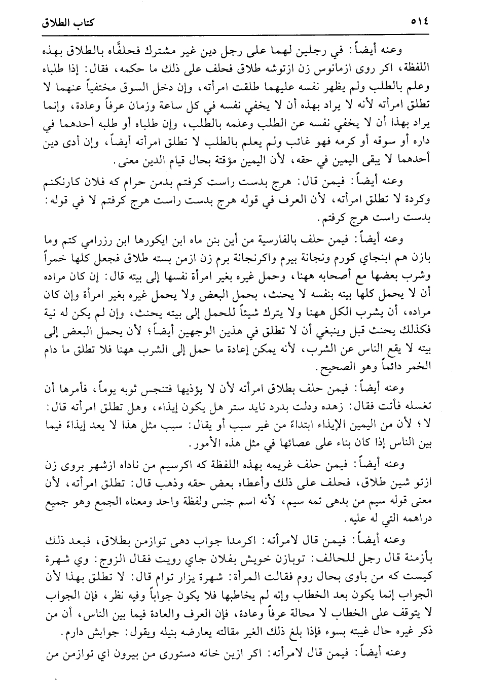 وعنه أيضاً: فيمن حلف غريمه بهذه اللفظة كه اكرسيم من ناداه ازشهر بروى زن ازتو شين طلاق، فحلف على ذلك وأعطاه بعض حقه وذهب قال: تطلق امرأته، لأن معنى قوله سيم من بدهى تمه سيم، لأنه اسم جنس ولفظة واحد ومعناه الجمع وهو جميع دراهمه التي له عليه.
