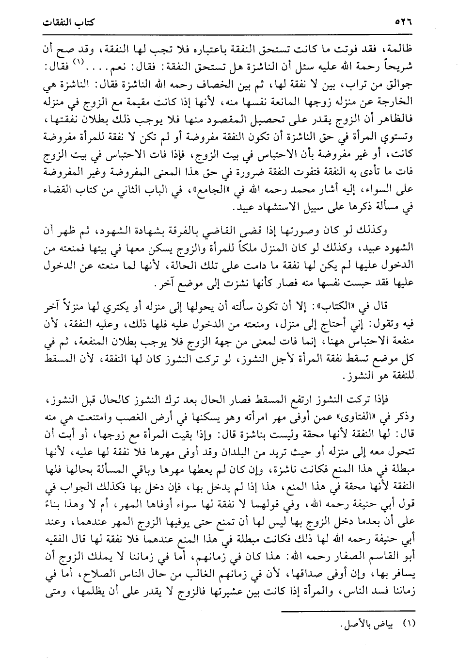 ظالمة، فقد فوتت ما كانت تستحق النفقة باعتباره فلا تجب لها النفقة، وقد صح أن شريحاً رحمة الله عليه سئل أن الناشزة هل تستحق النفقة: فقال: نعم.... فقال: جوالق من تراب، بين لا نفقة لها، ثم بين الخصاف رحمه الله الناشزة فقال: الناشزة هي الخارجة عن منزله زوجها المانعة نفسها منه، لأنها إذا كانت مقيمة مع الزوج في منزله فالظاهر أن الزوج يقدر على تحصيل المقصود منها فلا يوجب ذلك بطلان نفقتها، وتستوي المرأة في حق الناشزة أن تكون النفقة مفروضة أو لم تكن لا نفقة للمرأة مفروضة كانت، أو غير مفروضة بأن الاحتباس في بيت الزوج، فإذا فات الاحتباس في بيت الزوج فات ما تأدى به النفقة فتفوت النفقة ضرورة في حق هذا المعنى المفروضة وغير المفروضة على السواء، إليه أشار محمد رحمه الله في «الجامع» ، في الباب الثاني من كتاب القضاء في مسألة ذكرها على سبيل الاستشهاد عبيد.