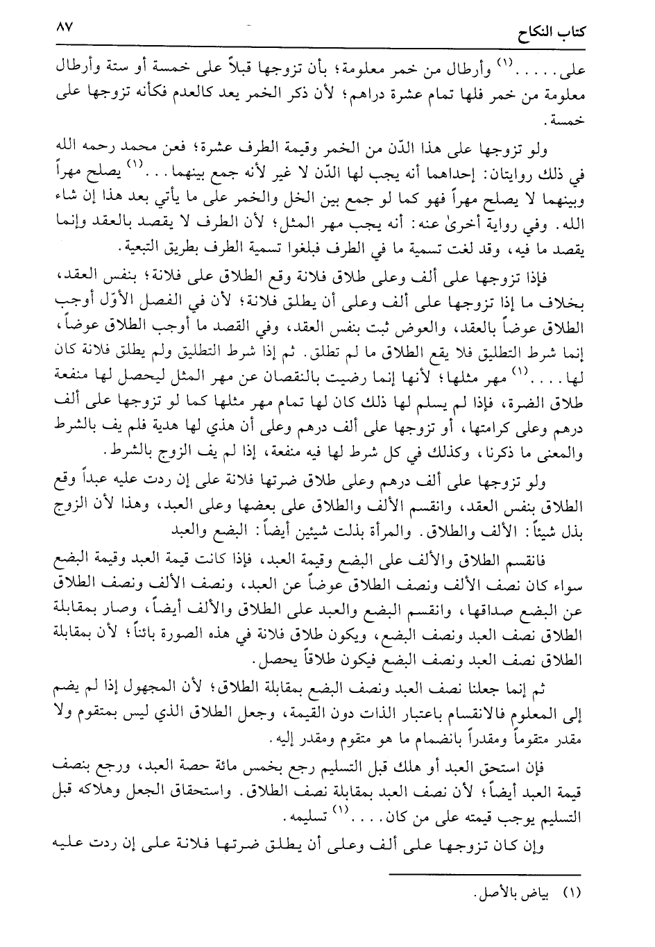 ولو تزوجها على هذا الدّن من الخمر وقيمة الطرف عشرة؛ فعن محمد رحمه الله في ذلك روايتان: إحداهما أنه يجب لها الدّن لا غير لأنه جمع بينهما.d