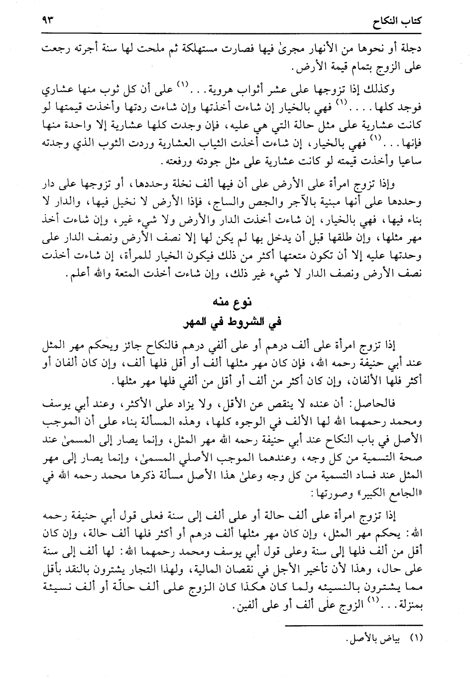 وكذلك إذا تزوجها على عشر أثواب هروية ... على أن كل ثوب منها عشاري فوجد كلها.... فهي بالخيار إن شاءت أخذتها وإن شاءت ردتها وأخذت قيمتها لو كانت عشارية على مثل حالة التي هي عليه، فإن وجدت كلها عشارية إلا واحدة منها فإنها.... فهي بالخيار، إن شاءت أخذت الثياب العشارية وردت الثوب الذي وجدته ساعيا وأخذت قيمته لو كانت عشارية على مثل جودته ورفعته.