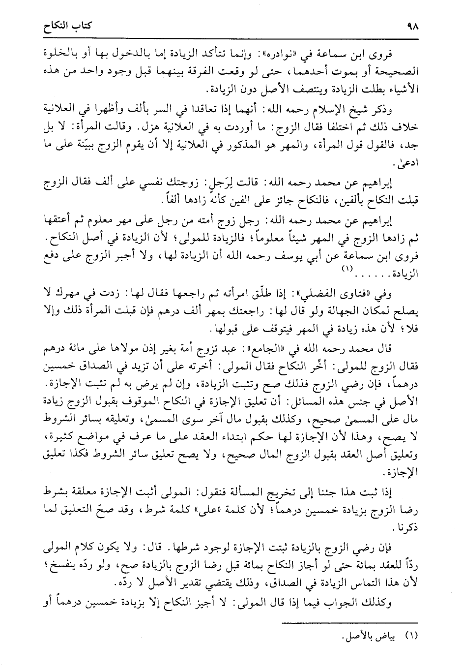 فإن رضي الزوج بالزيادة ثبتت الإجازة لوجود شرطها. قال: ولا يكون كلام المولى ردّاً للعقد بمائة حتى لو أجاز النكاح بمائة قبل رضا الزوج بالزيادة صح، ولو ردّه ينفسخ؛ لأن هذا التماس الزيادة في الصداق، وذلك يقتضي تقدير الأصل لا ردّه.