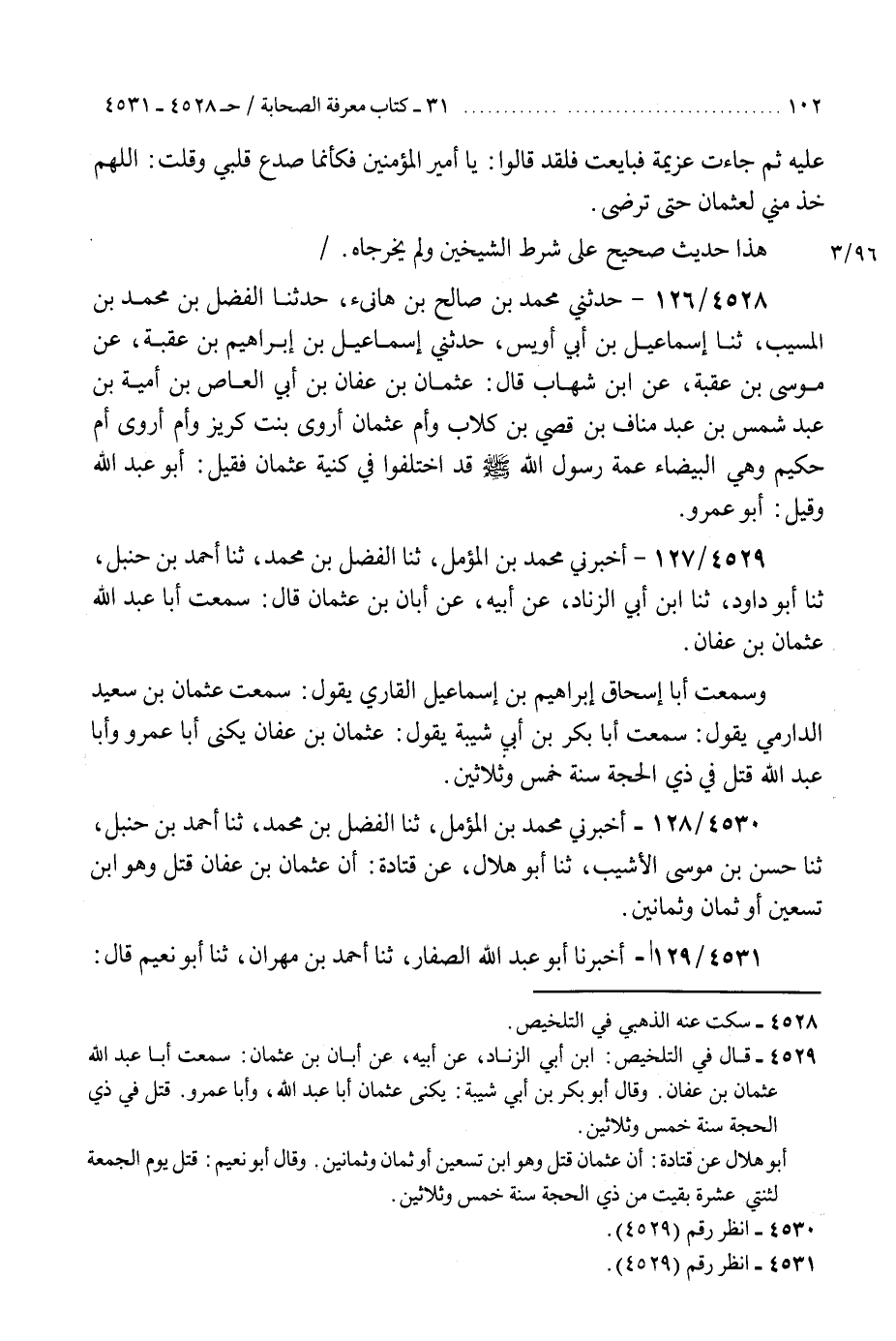 4529 - أَخْبَرَنِي مُحَمَّدُ بْنُ الْمُؤَمَّلٍ، ثنا الْفَضْلُ بْنُ مُحَمَّدٍ، ثنا أَحْمَدُ بْنُ حَنْبَلٍ، ثنا أَبُو دَاوُدَ، ثنا ابْنُ أَبِي الزِّنَادِ، عَنْ أَبِيهِ، عَنْ أَبَانَ بْنِ عُثْمَانَ، قَالَ: سَمِعْتُ أَبَا عَبْدِ اللَّهِ عُثْمَانَ بْنَ عَفَّانَ، وَسَمِعْتُ أَبَا إِسْحَاقَ إِبْرَاهِيمَ بْنَ إِسْمَاعِيلَ الْقَارِيَّ يَقُولُ: سَمِعْتُ عُثْمَانَ بْنَ سَعِيدٍ الدَّارِمِيَّ يَقُولُ: سَمِعْتُ أَبَا بَكْرِ بْنِ أَبِي شَيْبَةَ يَقُولُ: «§عُثْمَانَ بْنَ عَفَّانَ يُكَنَّى أَبَا عَمْرٍو، وَأَبَا عَبْدِ اللَّهِ قُتِلَ فِي ذِي الْحِجَّةِ سَنَةَ خَمْسٍ وَثَلَاثِينَ»