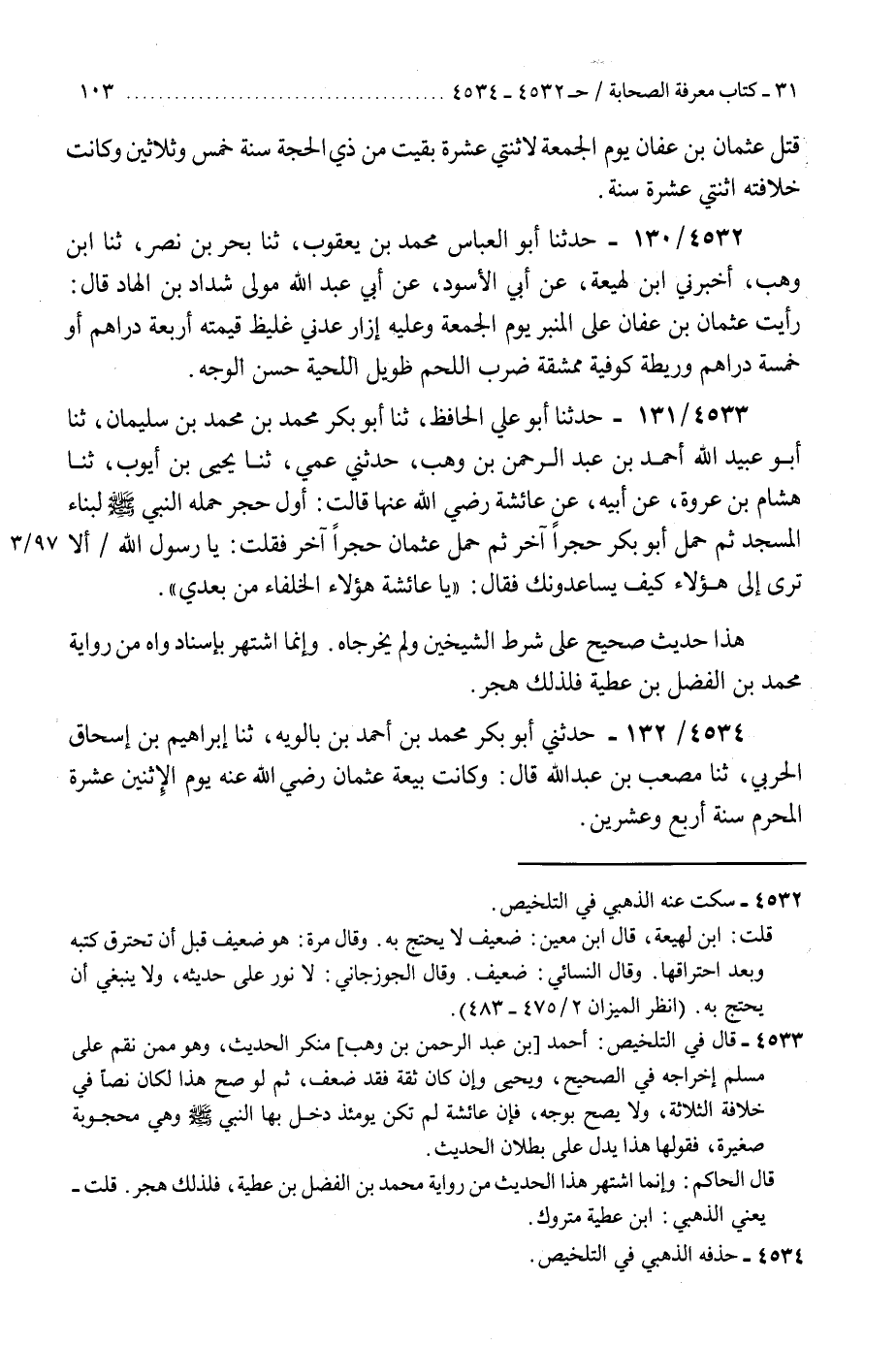 4534 - حَدَّثَنِي أَبُو بَكْرٍ مُحَمَّدُ بْنُ أَحْمَدَ بْنِ بَالَوَيْهِ، ثنا إِبْرَاهِيمُ بْنُ إِسْحَاقَ الْحَرْبِيُّ، ثنا مُصْعَبُ بْنُ عَبْدِ اللَّهِ قَالَ: §«وَكَانَتْ بَيْعَةُ عُثْمَانَ رَضِيَ اللَّهُ عَنْهُ يَوْمَ الِاثْنَيْنِ عَشْرَةَ الْمُحَرَّمِ سَنَةَ أَرْبَعٍ وَعِشْرِينَ» K4534 - حذفه الذهبي في التلخيص
