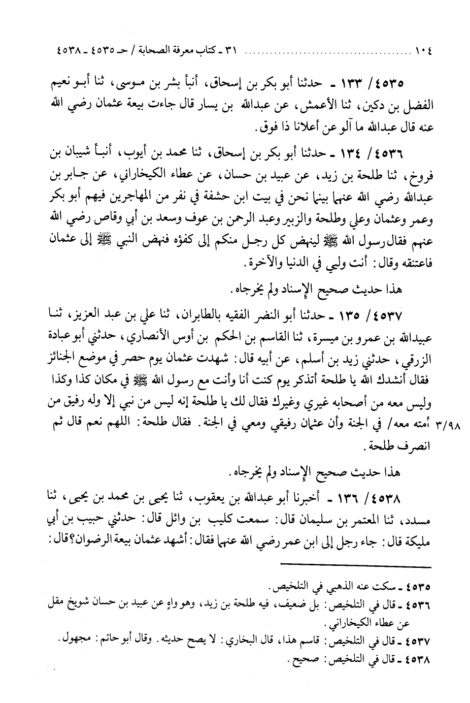 4538 - أَخْبَرَنَا أَبُو عَبْدِ اللَّهِ بْنُ يَعْقُوبَ، ثنا يَحْيَى بْنُ مُحَمَّدِ بْنُ يَحْيَى، ثنا مُسَدَّدٌ، ثنا الْمُعْتَمِرُ بْنُ سُلَيْمَانَ، قَالَ: سَمِعْتُ كُلَيْبَ بْنَ وَائِلٍ، قَالَ: حَدَّثَنِي حَبِيبُ بْنُ أَبِي مُلَيْكَةَ، قَالَ: جَاءَ رَجُلٌ إِلَى ابْنِ عُمَرَ رَضِيَ اللَّهُ عَنْهُمَا، فَقَالَ: أَشَهِدَ عُثْمَانُ بَيْعَةَ الرِّضْوَانِ؟ قَالَ: لَا، قَالَ: فَشَهِدَ بَدْرًا، قَالَ: لَا، قَالَ: " فَكَانَ مِمَّنِ اسْتَزَلَّهُ الشَّيْطَانُ؟ قَالَ: نَعَمْ، فَقَامَ الرَّجُلُ فَقَالَ لَهُ بَعْضُ الْقَوْمِ: إِنَّ هَذَا يَزْعُمُ الْآنَ أَنَّكَ وَقَعْتَ فِي عُثْمَانَ، قَالَ: كَذَلِكَ يَقُولُ: قَالَ: رُدُّوا عَلَيَّ الرَّجُلَ، فَقَالَ: عَقَلْتَ مَا قُلْتُ لَكَ؟ قَالَ: نَعَمْ، سَأَلْتُكَ هَلْ شَهِدَ عُثْمَانُ بَيْعَةَ الرِّضْوَانِ؟ قُلْتَ: لَا، وَسَأَلْتُكَ هَلْ شَهِدَ بَدْرًا؟ فَقُلْتُ: لَا، وَسَأَلْتُكَ هَلْ كَانَ مِمَّنِ اسْتَزَلَّهُ الشَّيْطَانُ؟ فَقُلْتَ: نَعَمْ، فَقَالَ: أَمَّا بَيْعَةُ الرِّضْوَانِ، فَإِنَّ رَسُولَ اللَّهِ صَلَّى اللهُ عَلَيْهِ وَسَلَّمَ قَامَ، فَقَالَ: «إِنَّ §عُثْمَانَ انْطَلَقَ فِي حَاجَةِ اللَّهِ وَحَاجَةِ رَسُولِهِ» فَضَرَبَ لَهُ بِسَهْمٍ، وَلَمْ يَضْرِبْ لِأَحَدٍ غَابَ غَيْرَهُ، وَأَمَّا الَّذِينَ تَوَلَّوْا يَوْمَ الْتَقَى الْجَمْعَانِ، إِنَّمَا اسْتَزَلَّهُمُ الشَّيْطَانُ بِبَعْضِ مَا كَسَبُوا، وَلَقَدْ عَفَا اللَّهُ عَنْهُمْ إِنَّ اللَّهَ غَفُورٌ حَلِيمٌ «هَذَا حَدِيثٌ صَحِيحُ الْإِسْنَادِ وَلَمْ يُخَرِّجَاهُ» K4538 - صحيح