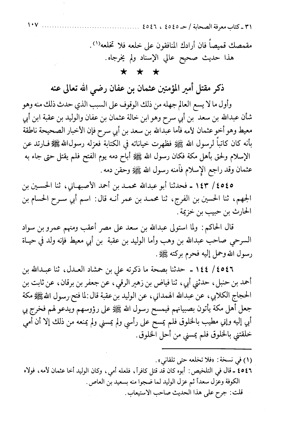 4545 - فَحَدَّثَنَا أَبُو عَبْدِ اللَّهِ مُحَمَّدُ بْنُ أَحْمَدَ الْأَصْبَهَانِيُّ، ثنا الْحَسَنُ بْنُ الْجَهْمِ، ثنا الْحُسَيْنُ بْنُ الْفَرَجِ، ثنا مُحَمَّدُ بْنُ عُمَرَ، أَنَّهُ قَالَ: §«اسْمُ أَبِي سَرْحٍ الْحُسَامُ بْنُ الْحَارِثِ بْنِ حَبِيبِ بْنِ خُزَيْمَةَ» قَالَ الْحَاكِمُ: «وَلَمَّا اسْتَوْلَى عَبْدُ اللَّهِ بْنُ سَعْدٍ عَلَى مِصْرَ، أَعْقَبَ وَمِنْهُمْ عَمْرُو بْنُ سَوَّادٍ السَّرْحِيُّ صَاحِبُ عَبْدِ اللَّهِ بْنِ وَهْبٍ، وَأَمَّا الْوَلِيدُ بْنُ عُقْبَةَ بْنِ أَبِي مُعَيْطٍ فَإِنَّهُ وُلِدَ فِي حَيَاةِ رَسُولِ اللَّهِ وَحُمِلَ إِلَيْهِ، فَحُرِمَ بَرَكَتُهُ صَلَّى اللهُ عَلَيْهِ وَسَلَّمَ»