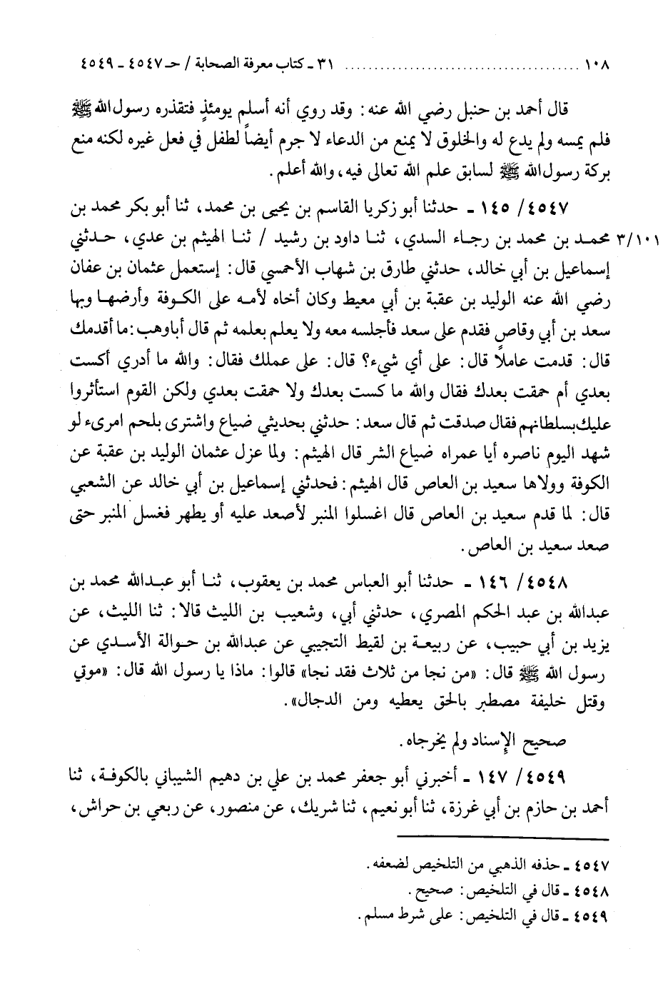 4547 - حَدَّثَنَا أَبُو زَكَرِيَّا الْقَاسِمُ بْنُ يَحْيَى بْنِ مُحَمَّدٍ، ثنا أَبُو بَكْرٍ مُحَمَّدُ بْنُ مُحَمَّدِ بْنِ مُحَمَّدِ بْنِ رَجَاءٍ السُّدِّيُّ، ثنا دَاوُدُ بْنُ رُشَيْدٍ، ثنا الْهَيْثَمُ بْنُ عَدِيٍّ، حَدَّثَنِي إِسْمَاعِيلُ بْنُ أَبِي خَالِدٍ، حَدَّثَنِي طَارِقُ بْنُ شِهَابٍ الْأَحْمَسِيُّ قَالَ: اسْتَعْمَلَ عُثْمَانُ بْنُ عَفَّانَ رَضِيَ اللَّهُ عَنْهُ الْوَلِيدَ بْنَ عُقْبَةَ بْنِ أَبِي مُعَيْطٍ، وَكَانَ أَخَاهُ لِأُمِّهِ عَلَى الْكُوفَةِ وَأَرْضِهَا وَبِهَا سَعْدُ بْنُ أَبِي وَقَّاصٍ، فَقَدِمَ عَلَى سَعْدٍ فَأَجْلَسَهُ مَعَهُ، وَلَا يَعْلَمُ بِعِلْمِهِ، ثُمَّ قَالَ أَبَا وَهْبٍ: مَا أَقْدَمَكَ؟ قَالَ: «قَدِمْتُ عَامِلًا» ، قَالَ: عَلَى أَيِّ شَيْءٍ؟ قَالَ: «عَلَى عَمَلِكَ» ، فَقَالَ: وَاللَّهِ مَا أَدْرِي أَكِسْتَ بَعْدِي، أَمْ حَمُقْتُ بَعْدَكَ؟ فَقَالَ: «وَاللَّهِ §مَا كِسْتُ بَعْدَكَ، وَلَا حَمُقْتَ بَعْدِي، وَلَكِنَّ الْقَوْمَ اسْتَأْثَرُوا عَلَيْكَ بِسُلْطَانِهِمْ» ، فَقَالَ: صَدَقْتَK4547 - حذفه الذهبي من التلخيص لضعفه
