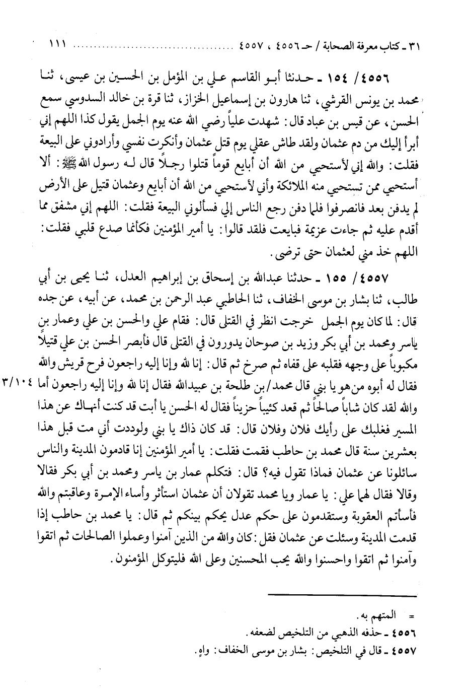 4557 - حَدَّثَنَا عَبْدُ اللَّهِ بْنُ إِسْحَاقَ بْنِ إِبْرَاهِيمَ، الْعَدْلُ، ثنا يَحْيَى بْنُ أَبِي طَالِبٍ، ثنا بَشَّارُ بْنُ مُوسَى الْخَفَّافُ، ثنا الْحَاطِبِيُّ عَبْدُ الرَّحْمَنِ بْنُ مُحَمَّدٍ، عَنْ أَبِيهِ، عَنْ جَدِّهِ قَالَ: لَمَّا كَانَ يَوْمُ الْجَمَلِ خَرَجْتُ أَنْظُرُ فِي الْقَتْلَى، قَالَ: فَقَامَ عَلِيٌّ، وَالْحَسَنُ بْنُ عَلِيٍّ، وَعَمَّارُ بْنُ يَاسِرٍ، وَمُحَمَّدُ بْنُ أَبِي بَكْرٍ، وَزَيْدُ بْنُ صُوحَانَ يَدُورُونَ فِي الْقَتْلَى، قَالَ: فَأَبْصَرَ الْحَسَنُ بْنُ عَلِيٍّ قَتِيلًا مَكْبُوبًا عَلَى وَجْهِهِ، فَقَلَبَهُ عَلَى قَفَاهُ، ثُمَّ صَرَخَ، ثُمَّ قَالَ: إِنَّا لِلَّهِ وَإِنَّا إِلَيْهِ رَاجِعُونَ، فَرِحَ قُرَيْشٌ وَاللَّهِ، فَقَالَ لَهُ أَبُوهُ: مَنْ هُوَ يَا بَنِي؟ قَالَ: مُحَمَّدُ بْنُ طَلْحَةَ بْنِ عُبَيْدِ اللَّهِ، فَقَالَ: إِنَّا لِلَّهِ وَإِنَّا إِلَيْهِ رَاجِعُونَ، أَمَا وَاللَّهِ لَقَدْ كَانَ شَابًّا صَالِحًا، ثُمَّ قَعَدَ كَئِيبًا حَزِينًا، فَقَالَ لَهُ الْحَسَنُ: يَا أَبَتِ، قَدْ كُنْتُ أَنْهَاكَ عَنْ هَذَا الْمَسِيرِ، فَغَلَبَكَ عَلَى رَأْيِكَ فُلَانٌ وَفُلَانٌ، قَالَ: قَدْ كَانَ ذَاكَ يَا بُنَيَّ، وَلَوَدِدْتُ أَنِّي مُتُّ قَبْلَ هَذَا بِعِشْرِينَ سَنَةً، قَالَ مُحَمَّدُ بْنُ حَاطِبٍ: فَقُمْتُ، فَقُلْتُ: يَا أَمِيرَ الْمُؤْمِنِينَ، إِنَّا قَادِمُونَ الْمَدِينَةَ، وَالنَّاسُ سَائِلُونَا عَنْ عُثْمَانَ، فَمَاذَا تَقُولُ فِيهِ؟ قَالَ: فَتَكَلَّمَ عَمَّارُ بْنُ يَاسِرٍ، وَمُحَمَّدُ بْنُ أَبِي بَكْرٍ فَقَالَا: وَقَالَا، فَقَالَ لَهُمَا عَلِيٌّ: " يَا عَمَّارُ، وَيَا مُحَمَّدُ تَقُولَانِ: أَنَّ عُثْمَانَ اسْتَأْثَرَ وَأَسَاءَ الْإِمْرَةَ، وَعَاقَبْتُمُ وَاللَّهِ، فَأَسْأَتُمُ الْعُقُوبَةَ، وَسَتَقْدُمُونَ عَلَى حَكَمٍ عَدْلٍ يَحْكُمُ بَيْنَكُمْ "، ثُمَّ قَالَ: " يَا مُحَمَّدُ بْنُ حَاطِبٍ إِذَا قَدِمْتَ الْمَدِينَةَ وَسُئِلَتْ عَنْ عُثْمَانَ، فَقُلْ: §كَانَ وَاللَّهِ مِنَ الَّذِينَ آمَنُوا وَعَمِلُوا الصَّالِحَاتِ، ثُمَّ اتَّقُوا وَآمَنُوا، ثُمَّ اتَّقُوا وَأَحْسَنُوا، وَاللَّهُ يُحِبُّ الْمُحْسِنِينَ، وَعَلَى اللَّهِ فَلْيَتَوَكَّلِ الْمُؤْمِنُونَ "K4557 - بشار بن موسى الخفاف واه