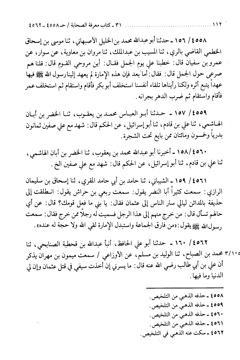 4560 - أَخْبَرَنَا أَبُو عَبْدِ اللَّهِ مُحَمَّدُ بْنُ يَعْقُوبَ، ثنا الْخَضِرُ بْنُ أَبَانَ الْهَاشِمِيُّ، ثنا عَلِيُّ بْنُ قَادِمٍ، ثنا أَبُو إِسْرَائِيلَ، عَنِ الْحَكَمِ قَالَ: «شَهِدَ مَعَ عَلِيٍّ صِفِّينَ» إِلَخْK4560 - حذفه الذهبي من التلخيص