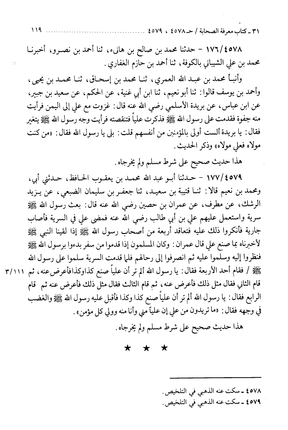4579 - حَدَّثَنَا أَبُو عَبْدِ اللَّهِ مُحَمَّدُ بْنُ يَعْقُوبَ الْحَافِظُ، حَدَّثَنِي أَبِي، وَمُحَمَّدُ بْنُ نُعَيْمٍ، قَالَا: ثنا قُتَيْبَةُ بْنُ سَعِيدٍ، ثنا جَعْفَرُ بْنُ سُلَيْمَانَ الضُّبَعِيُّ، عَنْ يَزِيدَ الرِّشْكِ، عَنْ مُطَرِّفٍ، عَنْ عِمْرَانَ بْنِ حُصَيْنٍ رَضِيَ اللَّهُ عَنْهُ قَالَ: بَعَثَ رَسُولُ اللَّهِ صَلَّى اللهُ عَلَيْهِ وَسَلَّمَ سَرِيَّةً، وَاسْتَعْمَلَ عَلَيْهِمْ عَلِيَّ بْنَ أَبِي طَالِبٍ رَضِيَ اللَّهُ عَنْهُ، فَمَضَى عَلِيٌّ فِي السَّرِيَّةِ فَأَصَابَ جَارِيَةً، فَأَنْكَرُوا ذَلِكَ عَلَيْهِ فَتَعَاقَدَ أَرْبَعَةٌ مِنْ أَصْحَابِ رَسُولِ اللَّهِ صَلَّى اللهُ عَلَيْهِ وَسَلَّمَ إِذَا لَقِينَا النَّبِيَّ صَلَّى اللهُ عَلَيْهِ وَسَلَّمَ لَأَخْبَرْنَاهُ بِمَا صَنَعَ عَلِيٌّ، قَالَ عِمْرَانُ: وَكَانَ الْمُسْلِمُونَ إِذَا قَدِمُوا مِنْ سَفَرٍ بَدَءُوا بِرَسُولِ اللَّهِ صَلَّى اللهُ عَلَيْهِ وَسَلَّمَ فَنَظَرُوا إِلَيْهِ وَسَلَّمُوا عَلَيْهِ، ثُمَّ انْصَرَفُوا إِلَى رِحَالِهِمْ، فَلَمَّا قَدِمَتِ السَّرِيَّةُ سَلَّمُوا عَلَى رَسُولِ اللَّهِ صَلَّى اللهُ عَلَيْهِ وَسَلَّمَ فَقَامَ أَحَدُ الْأَرْبَعَةِ فَقَالَ: يَا رَسُولَ اللَّهِ، أَلَمْ تَرَ أَنَّ عَلِيًّا صَنَعَ كَذَا وَكَذَا؟ فَأَعْرَضَ عَنْهُ، ثُمَّ قَامَ الثَّانِي، فَقَالَ مِثْلَ ذَلِكَ، فَأَعْرَضَ عَنْهُ، ثُمَّ قَامَ الثَّالِثُ، فَقَالَ مِثْلَ ذَلِكَ، فَأَعْرَضَ عَنْهُ، ثُمَّ قَامَ الرَّابِعُ، فَقَالَ: يَا رَسُولَ اللَّهِ، أَلَمْ تَرَ أَنَّ عَلِيًّا صَنَعَ كَذَا وَكَذَا، فَأَقْبَلَ عَلَيْهِ رَسُولُ اللَّهِ صَلَّى اللهُ عَلَيْهِ وَسَلَّمَ وَالْغَضَبُ فِي وَجْهِهِ، فَقَالَ: «مَا تُرِيدُونَ مِنْ عَلِيٍّ، إِنَّ §عَلِيًّا مِنِّي، وَأَنَا مِنْهُ وَوَلِيُّ كُلِّ مُؤْمِنٍ» هَذَا حَدِيثٌ صَحِيحٌ عَلَى شَرْطِ مُسْلِمٍ وَلَمْ يُخَرِّجَاهُ "K4579 - سكت عنه الذهبي في التلخيص
