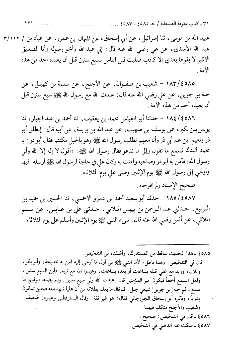 4585 - شُعَيْبُ بْنُ صَفْوَانَ، عَنِ الْأَجْلَحِ، عَنْ سَلَمَةَ بْنِ كُهَيْلٍ، عَنْ حَبَّةَ بْنِ جُوَيْنٍ، عَنْ عَلِيٍّ رَضِيَ اللَّهُ عَنْهُ قَالَ: §«عَبَدْتُ اللَّهَ مَعَ رَسُولِ اللَّهِ صَلَّى اللهُ عَلَيْهِ وَسَلَّمَ سَبْعَ سِنِينَ قَبْلَ أَنْ يَعْبُدَهُ أَحَدٌ مِنْ هَذِهِ الْأُمَّةِ» K4585 - وهذا باطل