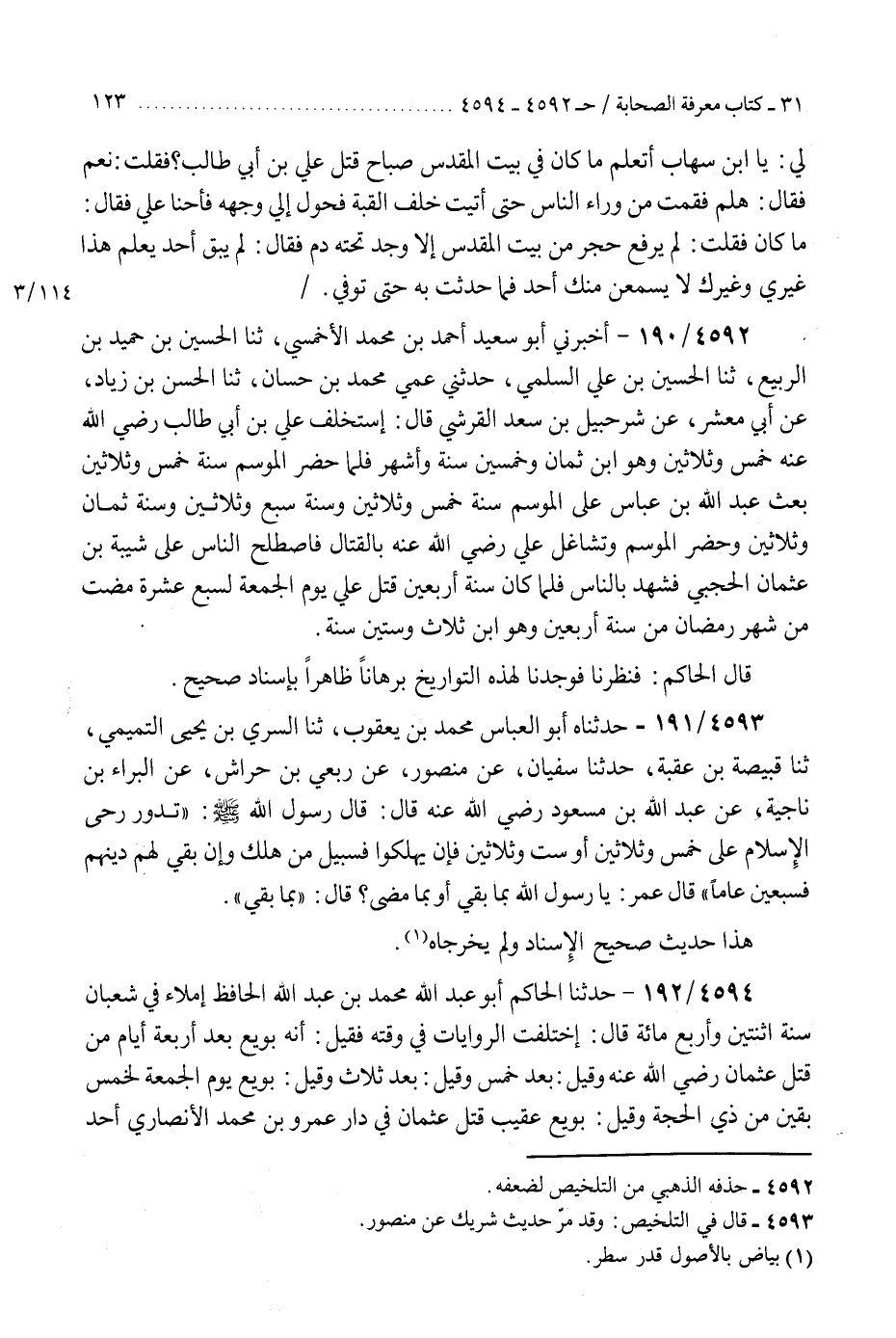 4592 - أَخْبَرَنِي أَبُو سَعِيدٍ أَحْمَدُ بْنُ مُحَمَّدٍ الْأَحْمَسِيُّ، ثنا الْحُسَيْنُ بْنُ حُمَيْدِ بْنِ الرَّبِيعِ، ثنا الْحُسَيْنُ بْنُ عَلِيٍّ السُّلَمِيُّ، حَدَّثَنِي عَمِّي مُحَمَّدُ بْنُ حَسَّانَ، ثنا الْحَسَنُ بْنُ زِيَادٍ، عَنْ أَبِي مَعْشَرٍ، عَنْ شُرَحْبِيلَ بْنِ سَعْدٍ الْقُرَشِيِّ قَالَ: «اسْتُخْلِفَ عَلِيُّ بْنُ أَبِي طَالِبٍ رَضِيَ اللَّهُ عَنْهُ خَمْسَ وَثَلَاثِينَ، وَهُوَ ابْنُ ثَمَانٍ وَخَمْسِينَ سَنَةً وَأَشْهُرٍ، فَلَمَّا حَضَرَ الْمَوْسِمُ سَنَةَ خَمْسٍ وَثَلَاثِينَ، §بَعَثَ عَبْدَ اللَّهِ بْنَ عَبَّاسٍ عَلَى الْمَوْسِمِ سَنَةَ خَمْسٍ وَثَلَاثِينَ، وَسَنَةَ سَبْعٍ وَثَلَاثِينَ وَسَنَةَ ثَمَانٍ وَثَلَاثِينَ، وَحَضَرَ الْمَوْسِمَ، وَتَشَاغَلَ عَلِيٌّ رَضِيَ اللَّهُ عَنْهُ بِالْقِتَالِ، فَاصْطَلَحَ النَّاسُ عَلَى شَيْبَةَ بْنِ عُثْمَانَ الْحَجَبِيِّ فَشَهِدَ بِالنَّاسِ، فَلَمَّا كَانَ سَنَةُ أَرْبَعِينَ قُتِلَ عَلِيٌّ يَوْمَ الْجُمُعَةِ، لِسَبْعَ عَشْرَةَ مَضَتْ مِنْ شَهْرِ رَمَضَانَ، مِنْ سَنَةِ أَرْبَعِينَ، وَهُوَ ابْنُ ثَلَاثٍ وَسِتِّينَ سَنَةً» قَالَ الْحَاكِمُ: «فَنَظَرْنَا فَوَجَدْنَا لِهَذِهِ التَّوَارِيخِ بُرْهَانًا ظَاهِرًا بِإِسْنَادٍ صَحِيحٍ» K4592 - حذفه الذهبي من التلخيص لضعفه