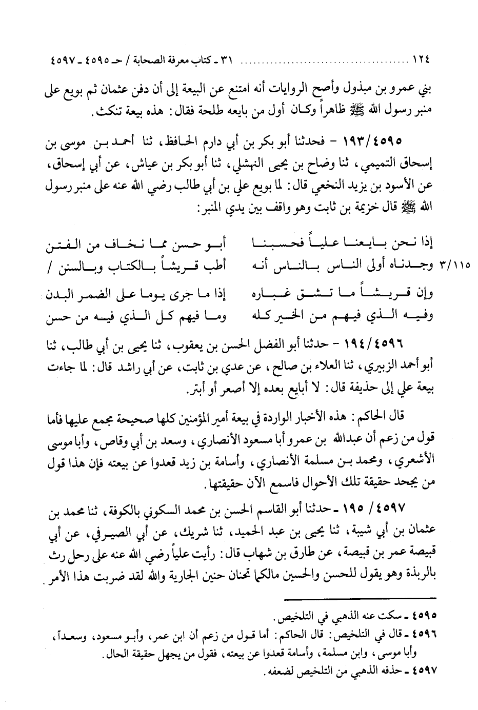 4596 - حَدَّثَنَا أَبُو الْفَضْلِ الْحَسَنُ بْنُ يَعْقُوبَ، ثنا يَحْيَى بْنُ أَبِي طَالِبٍ، ثنا أَبُو أَحْمَدَ الزُّبَيْرِيُّ، ثنا الْعَلَاءُ بْنُ صَالِحٍ، عَنْ عَدِيِّ بْنِ ثَابِتٍ، عَنْ أَبِي رَاشِدٍ قَالَ: لَمَّا جَاءَتْ بَيْعَةُ عَلِيٍّ إِلَى حُذَيْفَةَ قَالَ: §«لَا أُبَايِعُ بَعْدَهُ إِلَّا أَصْعَرَ أَوْ أَبْتَرَ» قَالَ الْحَاكِمُ: «هَذِهِ الْأَخْبَارُ الْوَارِدَةُ فِي بَيْعَةِ أَمِيرِ الْمُؤْمِنِينَ كُلُّهَا صَحِيحَةٌ مُجْمَعٌ عَلَيْهَا، فَأَمَّا قَوْلُ مَنْ زَعَمَ أَنَّ عَبْدَ اللَّهِ بْنَ عَمْرٍو أَبَا مَسْعُودٍ الْأَنْصَارِيَّ، وَسَعْدَ بْنَ أَبِي وَقَّاصٍ، وَأَبَا مُوسَى الْأَشْعَرِيَّ، وَمُحَمَّدَ بْنَ مَسْلَمَةَ الْأَنْصَارِيَّ، وَأُسَامَةَ بْنَ زَيْدٍ قَعَدُوا عَنْ بَيْعَتِهِ، فَإِنَّ هَذَا قَوْلُ مَنْ يَجْحَدُ حَقِيقَةَ تِلْكَ الْأَحْوَالِ فَاسْمَعِ الْآنَ حَقِيقَتَهَا»