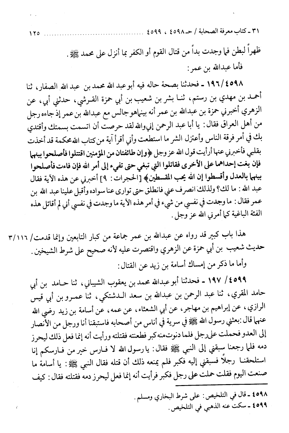 4598 - فَحَدَّثَنَا بِصِحَّةِ حَالِهِ فِيهِ أَبُو عَبْدِ اللَّهِ مُحَمَّدُ بْنُ عَبْدِ اللَّهِ الصَّفَّارُ، ثنا أَحْمَدُ بْنُ مَهْدِيِّ بْنِ رُسْتُمَ، ثنا بِشْرُ بْنُ شُعَيْبِ بْنِ أَبِي حَمْزَةَ الْقُرَشِيُّ، حَدَّثَنِي أَبِي، عَنِ الزُّهْرِيِّ، أَخْبَرَنِي حَمْزَةُ بْنُ عَبْدِ اللَّهِ بْنِ عُمَرَ أَنَّهُ، بَيْنَمَا هُوَ جَالِسٌ مَعَ عَبْدِ اللَّهِ بْنِ عُمَرَ إِذْ جَاءَهُ رَجُلٌ مِنْ أَهْلِ الْعِرَاقِ، فَقَالَ: يَا أَبَا عَبْدِ الرَّحْمَنِ، إِنِّي وَاللَّهِ لَقَدْ حَرَصْتُ أَنْ أَتَسَمَّتُ بِسَمْتِكَ، وَأَقْتَدِي بِكَ فِي أَمْرِ فُرْقَةِ النَّاسِ، وَأَعْتَزِلُ الشَّرَّ مَا اسْتَطَعْتُ، وَإِنِّي أَقْرَأُ آيَةً مِنْ كِتَابِ اللَّهِ مُحْكَمَةً قَدْ أَخَذَتْ بِقَلْبِي فَأَخْبِرْنِي عَنْهَا، أَرَأَيْتَ قَوْلَ اللَّهِ عَزَّ وَجَلَّ: {وَإِنْ طَائِفَتَانِ مِنَ الْمُؤْمِنِينَ اقْتَتَلُوا فَأَصْلِحُوا بَيْنَهُمَا فَإِنْ بَغَتْ إِحْدَاهُمَا عَلَى الْأُخْرَى فَقَاتِلُوا الَّتِي تَبْغِي حَتَّى تَفِيءَ إِلَى أَمْرِ اللَّهِ فَإِنْ فَاءَتْ فَأَصْلِحُوا بَيْنَهُمَا بِالْعَدْلِ وَأَقْسِطُوا إِنَّ اللَّهَ يُحِبُّ الْمُقْسِطِينَ} [الحجرات: 9] أَخْبِرْنِي عَنْ هَذِهِ الْآيَةِ، فَقَالَ عَبْدُ اللَّهِ: مَا لَكَ وَلِذَلِكَ؟ انْصَرِفْ عَنِّي، فَانْطَلَقَ حَتَّى تَوَارَى عَنّا سَوَادُهُ، وَأَقْبَلَ عَلَيْنَا عَبْدُ اللَّهِ بْنُ عُمَرَ فَقَالَ: §«مَا وَجَدْتُ فِي نَفْسِي مِنْ شَيْءٍ فِي أَمْرِ هَذِهِ الْآيَةِ مَا وَجَدْتُ فِي نَفْسِي أَنِّي لَمْ أُقَاتِلْ هَذِهِ الْفِئَةَ الْبَاغِيَةَ كَمَا أَمَرَنِي اللَّهُ عَزَّ وَجَلَّ» هَذَا بَابٌ كَبِيرٌ قَدْ رَوَاهُ عَنْ عَبْدِ اللَّهِ بْنِ عُمَرَ جَمَاعَةٌ مِنْ كِبَارِ التَّابِعِينَ، وَإِنَّمَا قَدَّمْتُ حَدِيثَ شُعَيْبَ بْنَ أَبِي حَمْزَةَ، عَنِ الزُّهْرِيِّ وَاقْتَصَرْتُ عَلَيْهِ لِأَنَّهُ صَحِيحٌ عَلَى شَرْطِ الشَّيْخَيْنِ "K4598 - على شرط البخاري ومسلم
