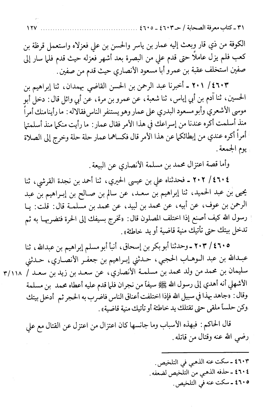 4605 - وَحَدَّثَنَا أَبُو بَكْرِ بْنُ إِسْحَاقَ، أَنْبَأَ أَبُو مُسْلِمٍ إِبْرَاهِيمُ بْنُ عَبْدِ اللَّهِ، ثنا عَبْدُ اللَّهِ بْنُ عَبْدِ الْوَهَّابِ الْحَجَبِيُّ، حَدَّثَنِي إِبْرَاهِيمُ بْنُ جَعْفَرٍ الْأَنْصَارِيُّ، حَدَّثَنِي سُلَيْمَانُ بْنُ مُحَمَّدٍ، مِنْ وَلَدِ مُحَمَّدِ بْنِ مَسْلَمَةَ الْأَنْصَارِيِّ، عَنْ سَعْدِ بْنِ زَيْدِ بْنِ سَعْدٍ الْأَشْهَلِيِّ، أَنَّهُ أَهْدَى إِلَى رَسُولِ اللَّهِ صَلَّى اللهُ عَلَيْهِ وَسَلَّمَ سَيْفًا مِنْ نَجْرَانَ، فَلَمَّا قَدِمَ عَلَيْهِ أَعْطَاهُ مُحَمَّدَ بْنَ مَسْلَمَةَ، وَقَالَ: «§جَاهِدْ بِهَذَا فِي سَبِيلِ اللَّهِ، فَإِذَا اخْتَلَفَتْ أَعْنَاقُ النَّاسِ فَاضْرِبْ بِهِ الْحَجَرَ، ثُمَّ ادْخُلْ بَيْتَكَ، وَكُنَّ حِلْسًا مُلْقًى حَتَّى تَقْتُلَكَ يَدٌ خَاطِئَةٌ، أَوْ تَأْتِيَكَ مَنِيَّةٌ قَاضِيَةٌ» قَالَ الْحَاكِمُ: «فَبِهَذِهِ الْأَسْبَابِ وَمَا جَانَسَهَا كَانَ اعْتِزَالُ مَنِ اعْتَزَلَ عَنِ الْقِتَالِ مَعَ عَلِيٍّ رَضِيَ اللَّهُ عَنْهُ، وَقِتَالِ مَنْ قَاتَلَهُ» K4605 - سكت عنه الذهبي في التلخيص