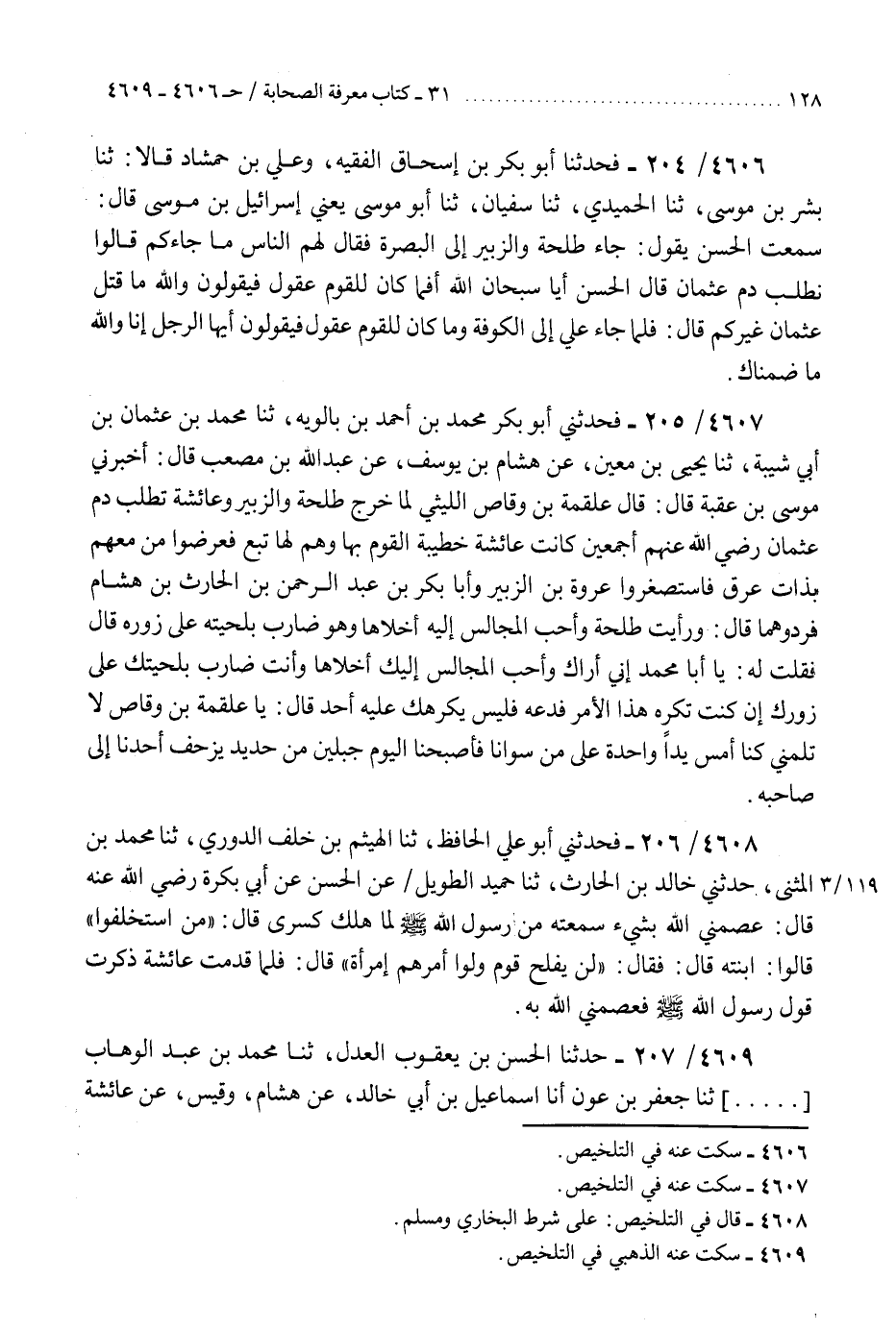 4606 - فَحَدَّثَنَا أَبُو بَكْرِ بْنُ إِسْحَاقَ الْفَقِيهُ، وَعَلِيُّ بْنُ حَمْشَاذٍ، قَالَا: ثنا بِشْرُ بْنُ مُوسَى، ثنا الْحُمَيْدِيُّ، ثنا سُفْيَانُ، ثنا أَبُو مُوسَى يَعْنِي إِسْرَائِيلَ بْنَ مُوسَى قَالَ: سَمِعْتُ الْحَسَنَ يَقُولُ: " §جَاءَ طَلْحَةُ وَالزُّبَيْرُ إِلَى الْبَصْرَةِ فَقَالَ لَهُمُ النَّاسُ: مَا جَاءَكُمْ؟ قَالُوا: نَطْلُبُ دَمَ عُثْمَانَ قَالَ الْحَسَنُ: أَيَا سُبْحَانَ اللَّهِ، أَفَمَا كَانَ لِلْقَوْمِ عُقُولٌ فَيَقُولُونَ: وَاللَّهِ مَا قَتَلَ عُثْمَانَ غَيْرُكُمْ؟ قَالَ: فَلَمَّا جَاءَ عَلِيٌّ إِلَى الْكُوفَةِ، وَمَا كَانَ لِلْقَوْمِ عُقُولٌ فَيَقُولُونَ: أَيُّهَا الرَّجُلُ إِنَّا وَاللَّهِ مَا ضَمَنَّاكَ "K4606 - سكت عنه الذهبي في التلخيص