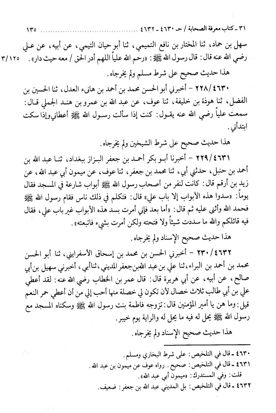 4631 - أَخْبَرَنَا أَبُو بَكْرٍ أَحْمَدُ بْنُ جَعْفَرٍ الْبَزَّازُ، بِبَغْدَادَ، ثنا عَبْدُ اللَّهِ بْنُ أَحْمَدَ بْنِ حَنْبَلٍ، حَدَّثَنِي أَبِي، ثنا مُحَمَّدُ بْنُ جَعْفَرٍ، ثنا عَوْفٌ، عَنْ مَيْمُونٍ أَبِي عَبْدِ اللَّهِ، عَنْ زَيْدِ بْنِ أَرْقَمَ قَالَ: كَانَتْ لِنَفَرٍ مِنْ أَصْحَابِ رَسُولِ اللَّهِ صَلَّى اللهُ عَلَيْهِ وَسَلَّمَ أَبْوَابٌ شَارِعَةٌ فِي الْمَسْجِدِ، فَقَالَ يَوْمًا: «سُدُّوا هَذِهِ الْأَبْوَابَ إِلَّا بَابَ عَلِيٍّ» قَالَ: فَتَكَلَّمَ فِي ذَلِكَ نَاسٌ فَقَامَ رَسُولُ اللَّهِ صَلَّى اللهُ عَلَيْهِ وَسَلَّمَ، فَحَمِدَ اللَّهَ، وَأَثْنَى عَلَيْهِ، ثُمَّ قَالَ: " أَمَّا بَعْدُ: §فَإِنِّي أُمِرْتُ بِسَدِّ هَذِهِ الْأَبْوَابِ غَيْرَ بَابِ عَلِيٍّ، فَقَالَ فِيهِ قَائِلُكُمْ، وَاللَّهِ مَا سَدَدْتُ شَيْئًا وَلَا فَتَحْتُهُ، وَلَكِنْ أُمِرْتُ بِشَيْءٍ فَاتَّبَعْتُهُ «هَذَا حَدِيثٌ صَحِيحُ الْإِسْنَادِ وَلَمْ يُخَرِّجَاهُ» K4631 - صحيح