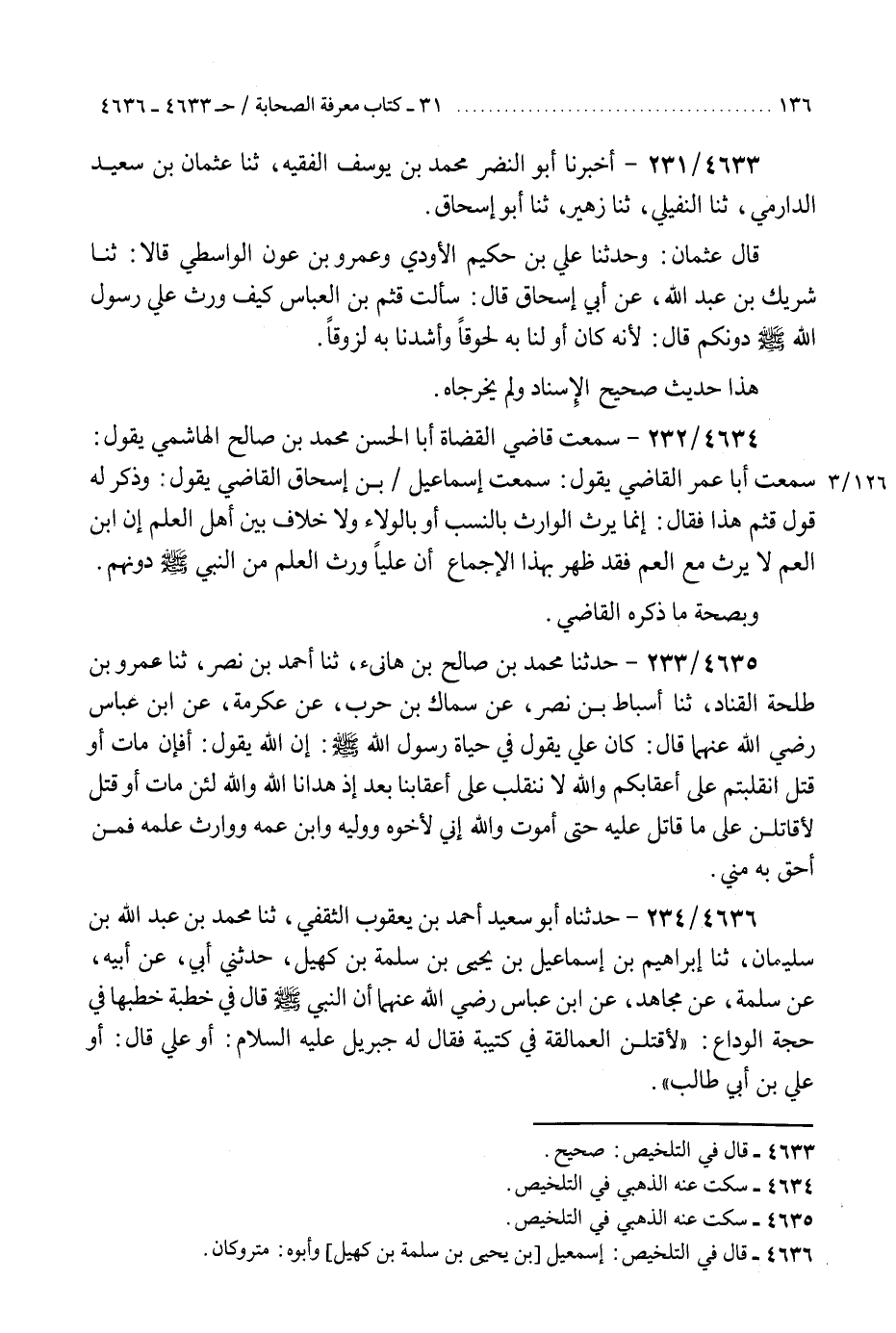4634 - سَمِعْتُ قَاضِي الْقُضَاةَ أَبَا الْحَسَنِ مُحَمَّدَ بْنَ صَالِحٍ الْهَاشِمِيَّ يَقُولُ: سَمِعْتُ أَبَا عُمَرَ الْقَاضِي يَقُولُ: سَمِعْتُ إِسْمَاعِيلَ بْنَ إِسْحَاقَ الْقَاضِي يَقُولُ: وَذُكِرَ لَهُ قَوْلُ قُثَمَ هَذَا، فَقَالَ: «إِنَّمَا يَرِثُ الْوَارِثُ بِالنَّسَبِ أَوْ بِالْوَلَاءِ، وَلَا خِلَافَ بَيْنَ أَهْلِ الْعِلْمِ أَنَّ ابْنَ الْعَمِّ لَا يَرِثُ مَعَ الْعَمِّ، فَقَدْ ظَهَرَ بِهَذَا الِإِجْمَاعِ أَنَّ عَلِيًّا وَرِثَ الْعِلْمَ مِنَ النَّبِيِّ صَلَّى اللهُ عَلَيْهِ وَسَلَّمَ دُونَهُمْ، وَبِصِحَّةِ مَا ذَكَرَهُ الْقَاضِي» K4634 - سكت عنه الذهبي في التلخيص