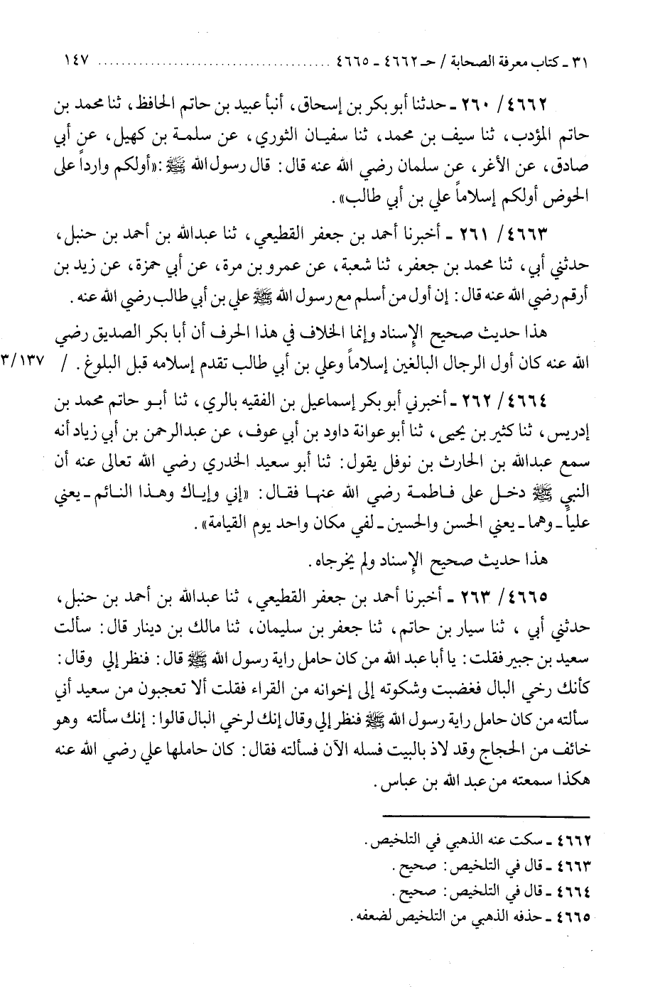 4662 - حَدَّثَنَا أَبُو بَكْرِ بْنُ إِسْحَاقَ، أَنْبَأَ عُبَيْدُ بْنُ حَاتِمٍ الْحَافِظُ، ثنا مُحَمَّدُ بْنُ حَاتِمٍ الْمُؤَدِّبُ، ثنا سَيْفُ بْنُ مُحَمَّدٍ، ثنا سُفْيَانُ الثَّوْرِيُّ، عَنْ سَلَمَةَ بْنِ كُهَيْلٍ، عَنْ أَبِي صَادِقٍ، عَنِ الْأَغَرِّ، عَنْ سَلْمَانَ رَضِيَ اللَّهُ عَنْهُ قَالَ: قَالَ رَسُولُ اللَّهِ صَلَّى اللهُ عَلَيْهِ وَسَلَّمَ: «§أَوَّلُكُمْ وَارِدًا عَلَى الْحَوْضِ، أَوَّلُكُمْ إِسْلَامًا، عَلِيُّ بْنُ أَبِي طَالِبٍ» K4662 - سكت عنه الذهبي في التلخيص