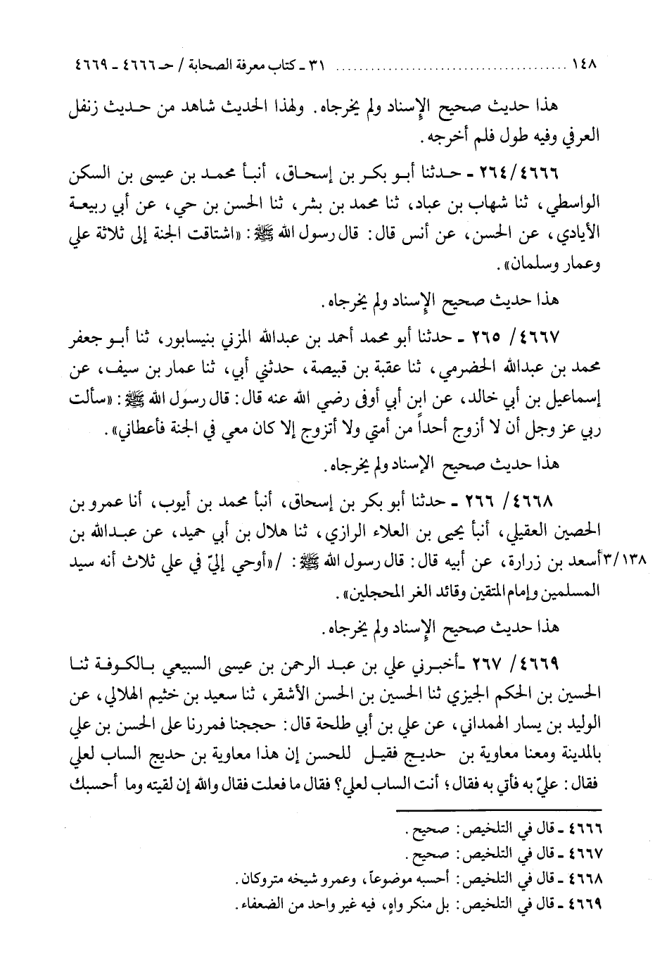 4668 - حَدَّثَنَا أَبُو بَكْرِ بْنُ إِسْحَاقَ، أَنْبَأَ مُحَمَّدُ بْنُ أَيُّوبَ، أَنَا عَمْرُو بْنُ الْحُصَيْنِ الْعُقَيْلِيُّ، أَنْبَأَ يَحْيَى بْنُ الْعَلَاءِ الرَّازِيُّ، ثنا هِلَالُ بْنُ أَبِي حُمَيْدٍ، عَنْ عَبْدِ اللَّهِ بْنِ أَسْعَدَ بْنِ زُرَارَةَ، عَنْ أَبِيهِ قَالَ: قَالَ رَسُولُ اللَّهِ صَلَّى اللهُ عَلَيْهِ وَسَلَّمَ: " §أُوحِيَ إِلَيَّ فِي عَلِيٍّ ثَلَاثٍ: أَنَّهُ سَيِّدُ الْمُسْلِمِينَ، وَإِمَامُ الْمُتَّقِينَ، وَقَائِدُ الْغُرِّ الْمُحَجَّلِينَ «هَذَا حَدِيثٌ صَحِيحُ الْإِسْنَادِ، وَلَمْ يُخَرِّجَاهُ» K4668 - أحسبه موضوعا